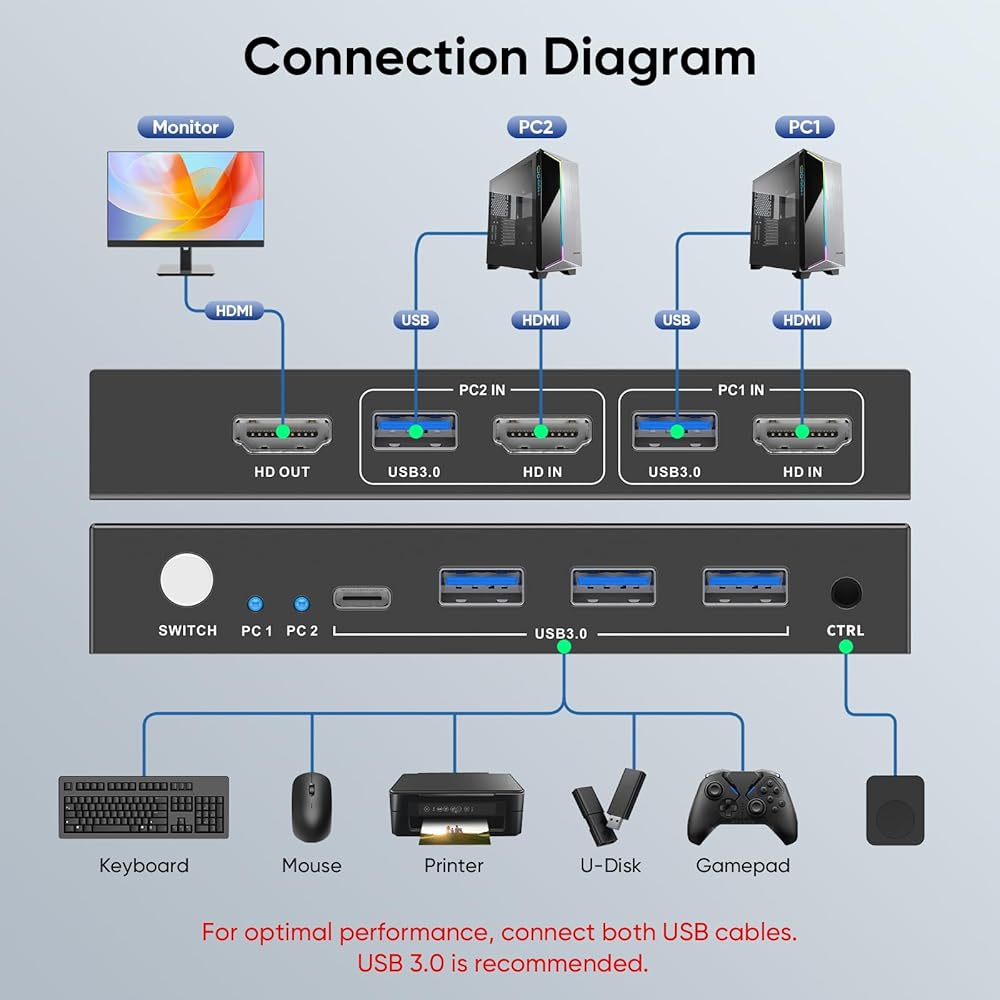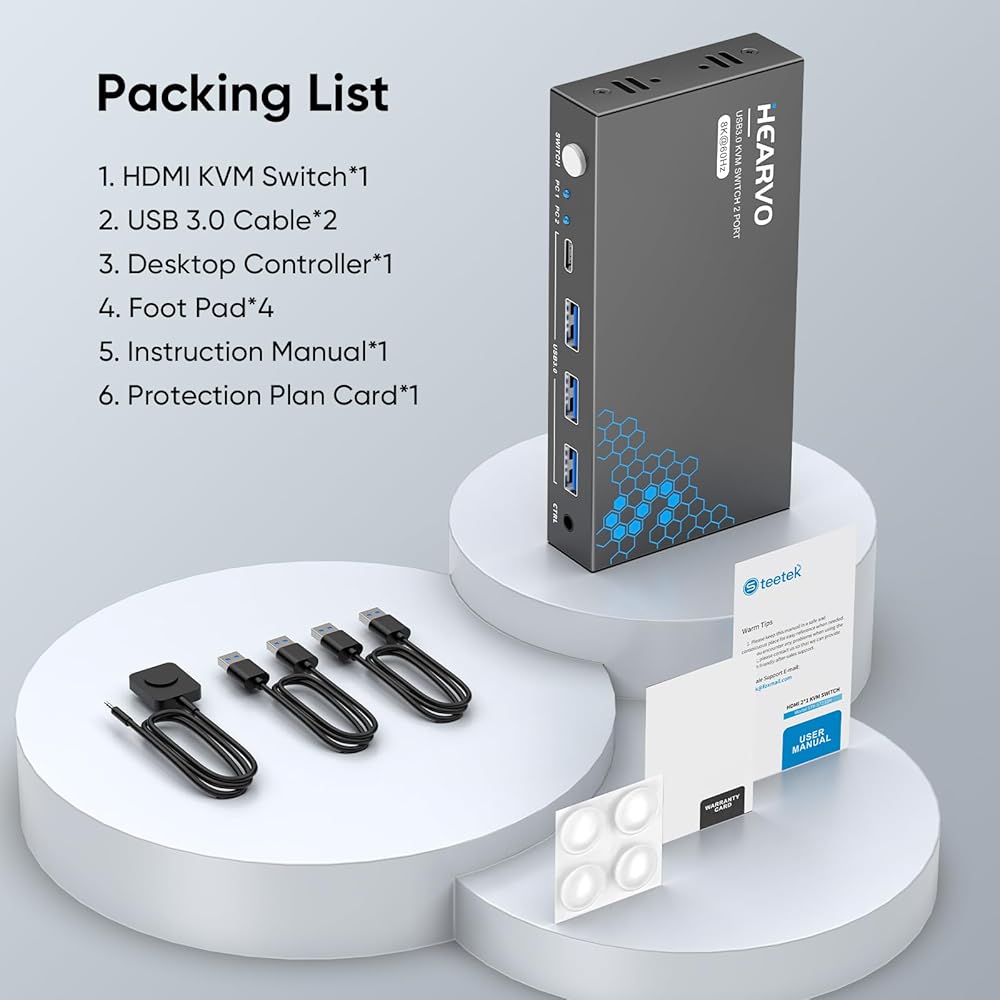 【خدمة ما بعد البيع】يأتي محول HDMI KVM الخاص بنا مزودًا بكابلين USB 3.0 ومفتاح تحكم عن بعد سلكي واحد. يرجى ملاحظة أنك تحتاج إلى إعداد 3 كابلات HDMI 2.1 لتوصيل جهازي كمبيوتر وشاشة واحدة. نحن نقدم ضمانًا مدى الحياة لمنتجاتنا. للحصول على مساعدة أسرع، يرجى الاتصال بنا باستخدام رقم الطلب الخاص بك. وسوف نقدم لك الحل.