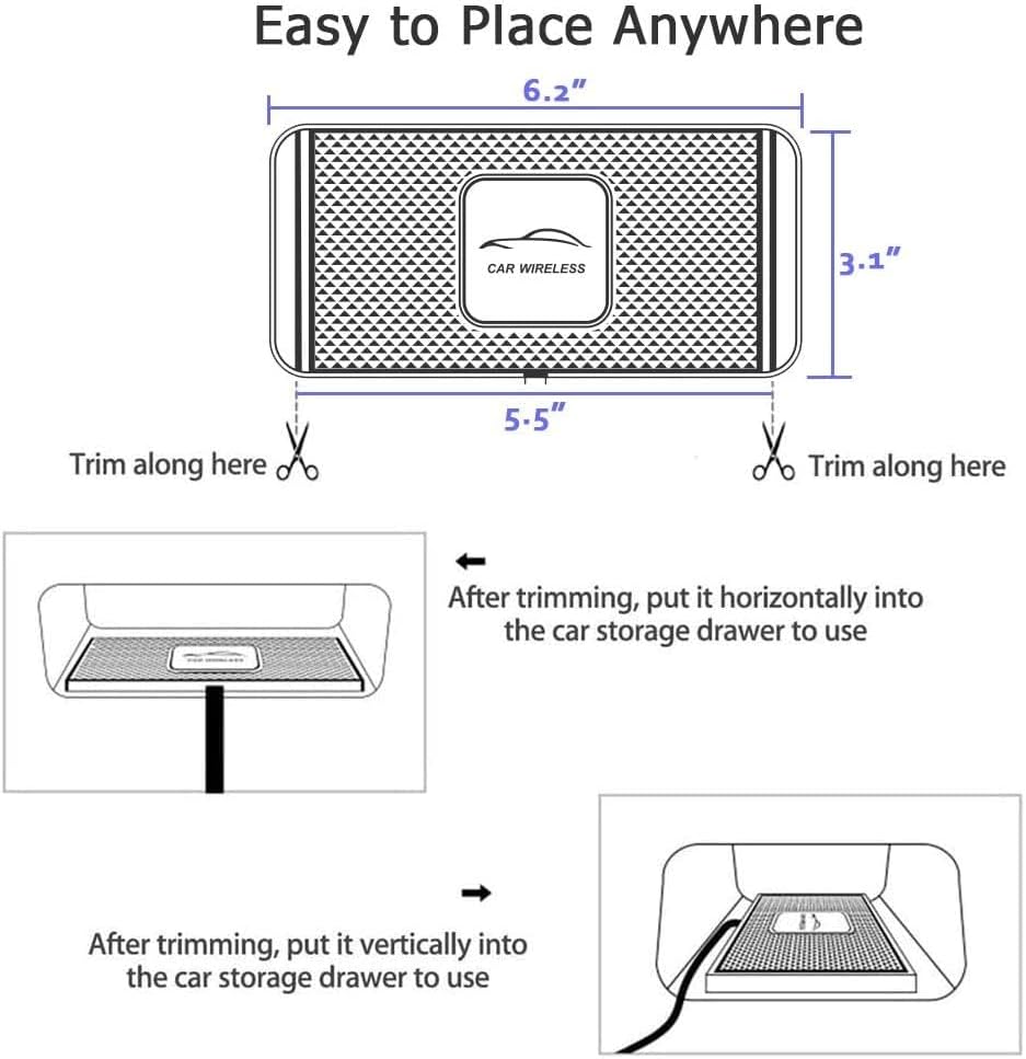 لوحة شحن عالمية DIY Qi - قاعدة شاحن السيارة اللاسلكية هذه قابلة للتشذيب بحيث يمكنك تقليم اللوحة بالحجم المثالي لصندوق تخزين سيارتك / وحدة التحكم المركزية في السيارة أو في أي مكان آخر مثل سطح لوحة القيادة المسطحة / الطاولة / المكتب / المنضدة. غرفة النوم / غرفة المعيشة / غرفة المكتب / غرفة الاجتماعات / غرفة العرض، متجر متعدد الأقسام أو المدرسة لشحن هواتفك بدون حبال، محمولة جدًا للاستخدام في المنزل أو السفر.