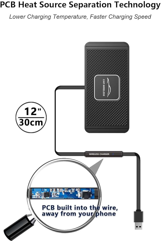 شاحن لاسلكي مع محول سيارة QC 3.0 - تأتي لوحة الشحن qi هذه + مجموعة الشحن السريع لمحول السيارة QC 3.0 بقدرة 38 واط مع أحدث تصميم فريد مضاد للحرارة الزائدة ومناسب للسيارات المختلفة مثل Mazda وLX Lexus وBMW وTesla Model 3/Y، نيسان ألتيما، هوندا سيفيك/ أكورد، تويوتا كامري/كورولا/تاكوما، شيفروليه سيلفرادو، فورد إسكيب/سلسلة إف إلخ. مع سطح لوحة القيادة المسطح. لن تسخن السجادة اللاسلكية أثناء الشحن لأن لوحة PCB بالخارج بعيد عن ملف الشاحن والهاتف