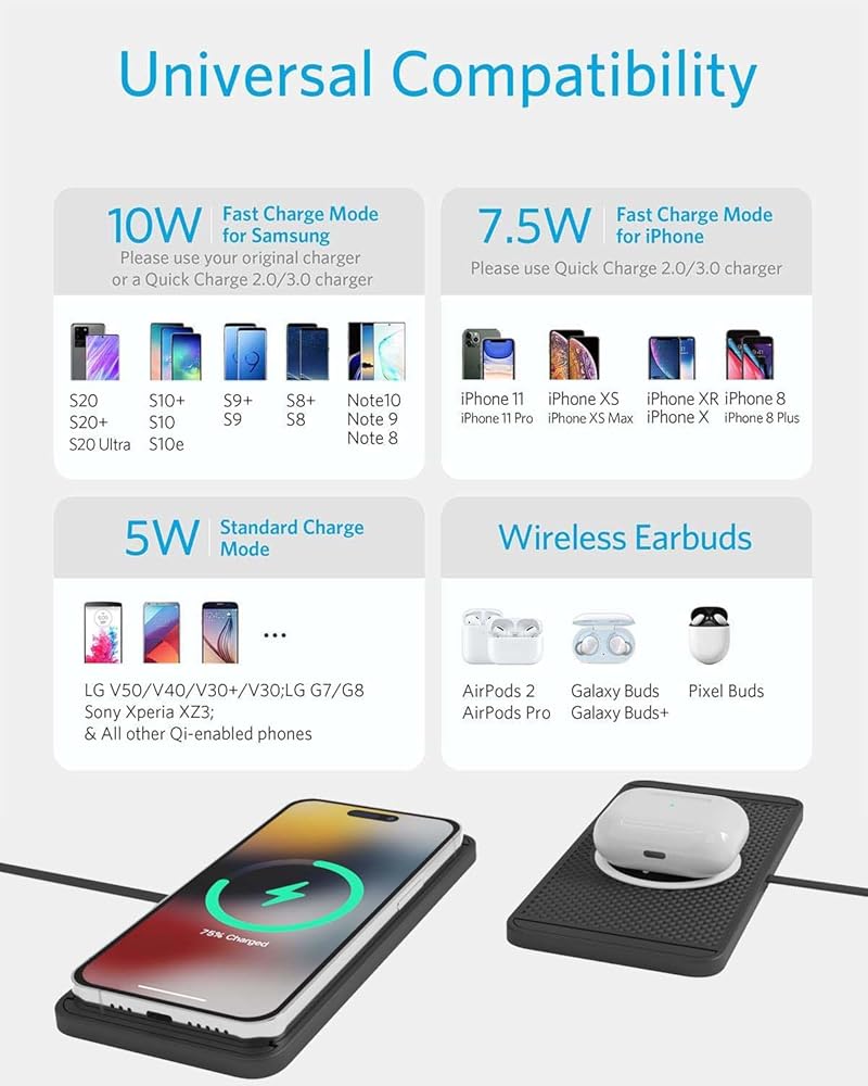 شاحن هاتف لاسلكي لهواتف iPhone وAndroid المحمولة - يعمل بشكل لا تشوبه شائبة مع سرعة الشحن العادية أو السريعة: 15 وات لهاتف LG G7 G7+ G8 G8S G8X V30 V30+ V30S V35 V50 V50S V40 ThinQ / Samsung Galaxy S23 S21 S20 S20+ Note 21 20 10+ (5G)، 10 وات لهاتف S10 S10+ S9 S9+ S8+ S8 Active S7 edge S6 edge+، Note 10 9 8 7، Sony Xperia Xz2 Xz3 Xz4، MOTO Z، Nokia 8 Sirocco & 9 Pureview إلخ. 7.5 وات لهاتف iPhone 15 14 13 12 mini 11 X XS XR & برو ماكس / 8 & بلس حتى الآن؛ 5 وات لأي هواتف ذكية تدعم الشحن اللاسلكي Qi