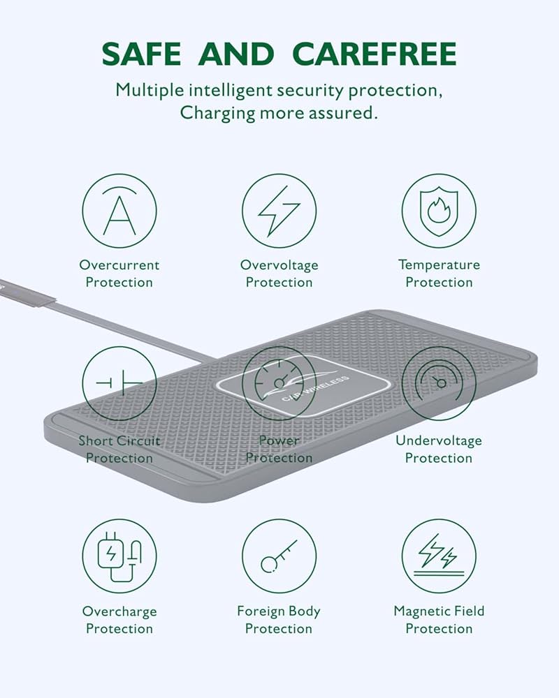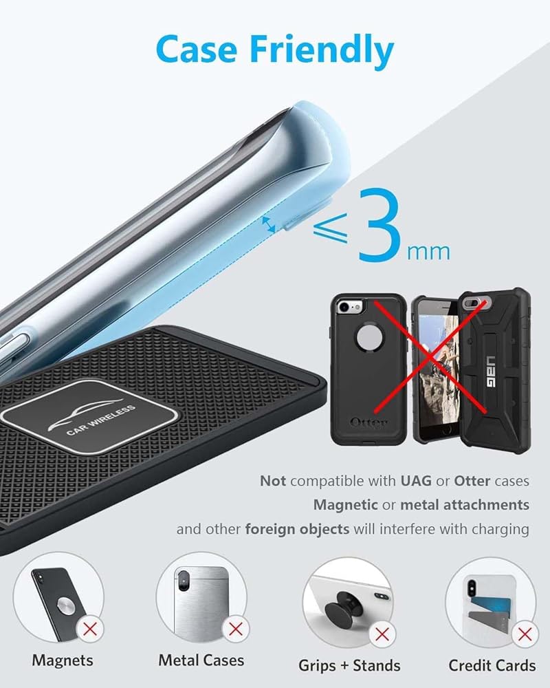 قاعدة شحن سيارة لاسلكية ممتازة Qi - القاعدة الرفيعة مصنوعة من مطاط السيليكون المضاد للانزلاق (غير قابل للانزلاق) لحمل هاتفك والحفاظ عليه في مكان حصيرة الشحن الناعم الذي يمكن أن يمنع هاتفك من السقوط ويضمن شحنًا جيدًا الخبرة بغض النظر عن الطريق الوعر أو في منطقة التباطؤ؛ إنها قابلة للغسل وإعادة الاستخدام وإعادة التدوير ومقاومة للحرارة.