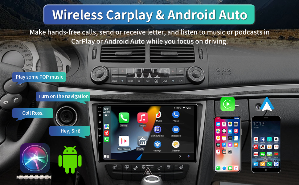 【𝐖𝐢𝐫𝐞𝐥𝐞𝐬𝐬 𝐂𝐚𝐫𝐩𝐥𝐚𝐲 & 𝐖𝐢𝐫𝐞𝐥𝐞𝐬𝐬 𝐀𝐧𝐝𝐫𝐨𝐢 𝐝 𝐀𝐮𝐭𝐨】استمتع بـ CarPlay اللاسلكي وAndroid Auto السلكي/اللاسلكي مع Bluetooth 5.0 للاتصال السريع والسهل. ما عليك سوى التحدث إلى Siri/Hey Google أو لمس الشاشة للحصول على الاتجاهات من خريطة هاتفك، وإجراء المكالمات، والاستماع إلى رسائل البريد الصوتي، وإرسال واستقبال الرسائل النصية، والاستماع إلى الموسيقى المفضلة لديك، كل ذلك مع الحفاظ على تركيزك على الطريق.