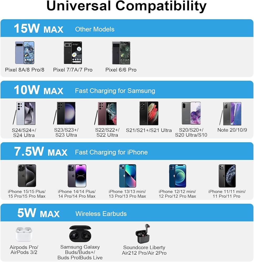 📱توافق واسع: يوفر شاحن موتورولا اللاسلكي شحن سريع بقدرة 15 وات كحد أقصى. وضع شحن 15 وات لموتورولا Edge 2024، G Stylus 5G 2024، G Power 2024، Edge 50 Ultra Pro، Razr 2023 2022، X50 Ultra X40، Razr 40 Ultra، Pixel 8 Pro /8/7A/7/7 Pro/6/6 Pro/5/4/3,10 واط شحن سريع لهاتف Samsung Galaxy S24 Ultra/S24 Plus/S24/S23 Ultra/S23 FE/S23+/S23/S22/S22+/S22 الترا/S21/S21+/S21 الترا/S21 FE/S10. وضع الشحن اللاسلكي 7.5 واط لجهاز iPhone 15 14 13 12 وضع الشحن القياسي 11.5 واط لاستخدام أجهزة الشحن اللاسلكي.