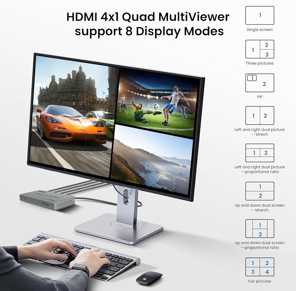 خيارات عرض مرنة: يحتوي جهاز العرض المتعدد HDMI 4K@60hz على 8 أوضاع عرض متعددة الاستخدامات لعرض إشارات متعددة على شاشة واحدة، بما في ذلك: شاشة كاملة، مزدوجة جنبًا إلى جنب، مزدوجة علوية وسفلية، PIP، 4 شاشات متساوية، و1 كبيرة و3 أوضاع صغيرة، مما يوفر خيارات مرنة للحياة والعمل.
