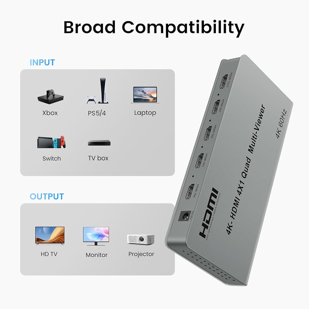 توافق عالمي: يتوافق عارض HDMI الرباعي المتعدد مع مجموعة واسعة من أجهزة HDMI مثل الكاميرات الأمنية وأجهزة إكس بوكس ومشغلات بلو راي وأجهزة التلفاز عالية الدقة وأجهزة العرض والشاشات والمزيد. التوصيل والتشغيل، وسهل التشغيل. يساعد على تحقيق تنوع التطبيقات المختلفة