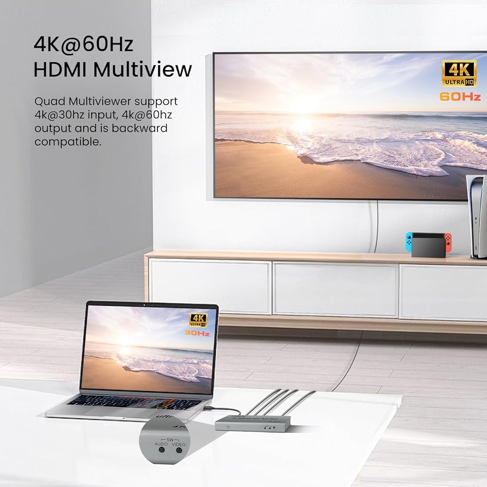 التبديل السلس: يضمن مفتاح HDMI المتعدد 4 في 1 التبديل السلس بين أربعة مصادر إدخال HDMI عند استخدامه في الشاشة الكاملة، مما يتيح وظيفة مفتاح HDMI بالإضافة إلى القدرة على عرض مصادر متعددة على شاشة واحدة. وهذا يضمن تجربة مشاهدة ممتعة.
