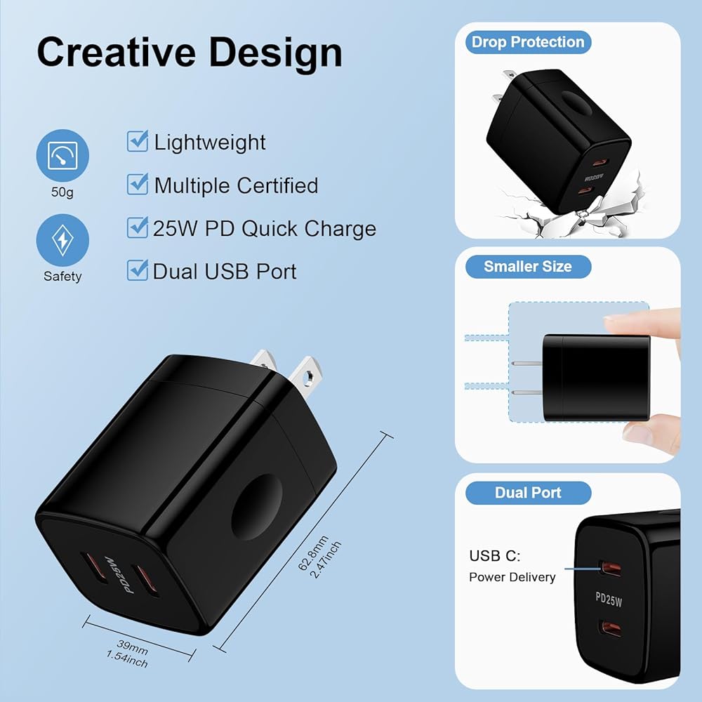 • 【25W Fast Charging Charger Block】: Equipped with a super fast charging PD3.0 PPS and QC3.0 technology type-c port.Charging at high speed up to 25W if connecting one device, such as Samsung, iPhone 15, Google, or LG. This 25W type c adapter plug charges your Phone to 70% in just 30min, which means 5 times as fast as an original 5W type c wall charger, charging your phone (about 3A) from 0% to 100% in just 1h.Motorola phone charger with 2 ports to allow you to charge 2 devices at the same time.