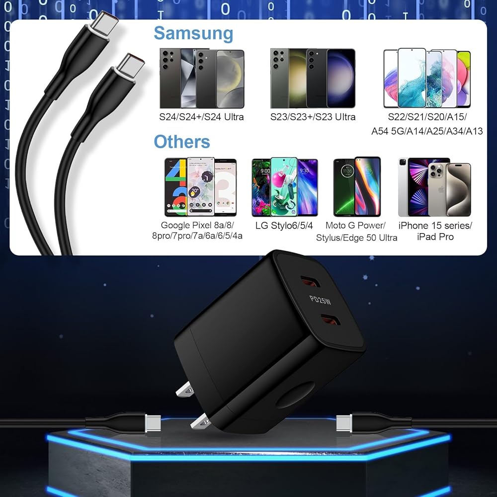 • 【We Care For You】: 25W motorola samsung phone charger combo package contents: 1x 25W Dual Fast PD Wall Charger+1x 6ft USB C to USB C fast charging cord, backed up by our worry-free 12-month warranty and 24/7 friendly customer service.If there is any problem with our moto g stylus charger samsung galaxy a15 5g charger, please do not hesitate to contact us!