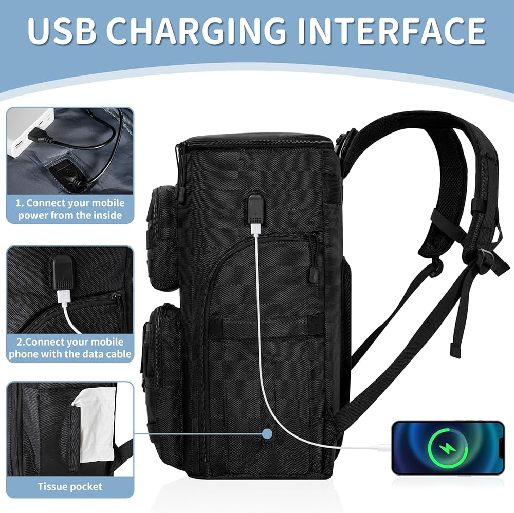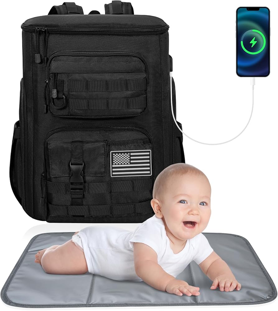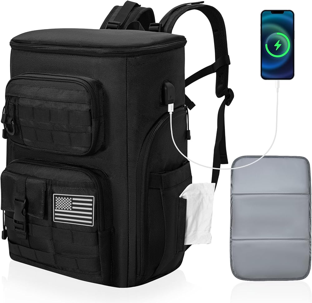 حقيبة حفاضات للأب، حقيبة ظهر للحفاضات العسكرية، حقيبة كبيرة لحفاضات الأطفال للرجال مع حصيرة تغيير الحفاضات وأشرطة بمنفذ شحن USB لعربة الأطفال وجيب معزول