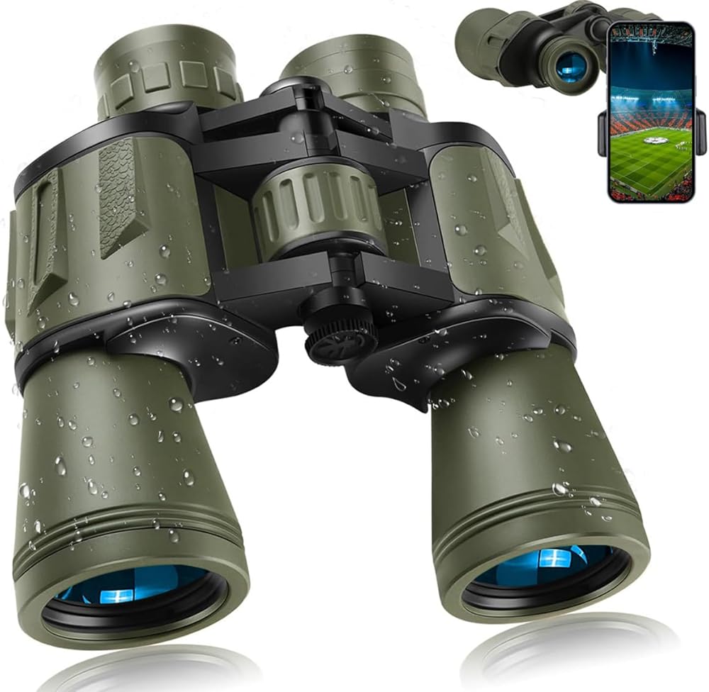 مناظير عالية الطاقة 20 × 50 للبالغين، تلسكوب مناظير مدمج مع رؤية منخفضة الإضاءة لمشاهدة الطيور والسفر وحفلات النجوم والتخييم - عدسة BAK4 Prism FMC مع محول الهاتف، مقاومة للماء