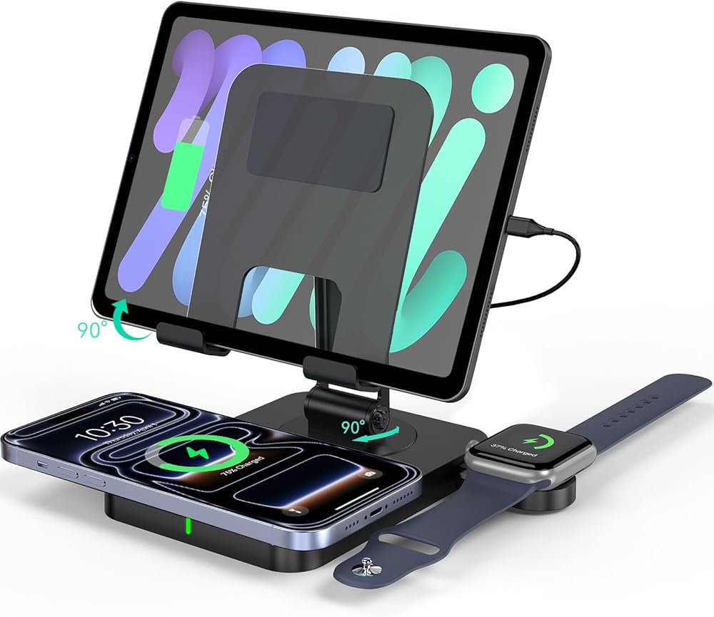 【 محطة شحن Apple الكل في واحد 】محطة شحن قابلة للطي 3 في 1 لأجهزة متعددة، تدعم شحن iPad وiPhone وiWatch وAirPods. شاحن Magsafe لسلسلة iPhone 15 /14/13/12، شاحن لاسلكي لساعة Apple Watch Ultra/9/8/7/6/5/4/3/2، لـ AirPods Pro/3/2. حجم صغير، تصميم جيد، شحن سريع، توفير المساحة، ما تحتاجه بالضبط!