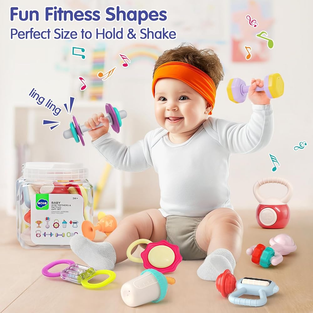 🏆 أشكال اللياقة البدنية الممتعة: 9 قطع من ألعاب الأطفال تتميز بتصميمات مرحة، بما في ذلك خشخشة الدمبل، وخشخشة الجرس، وخشخيشة الجرس، وموسع الصدر التظاهري، وخشخشة مسدس التدليك، وخشخشة الكأس، وخشخشة الميدالية، وخشخشة التدليك، وتسنين الجرس. حجم مثالي ليحمله الطفل ويهزه. ألعاب الأطفال المثالية من 0 إلى 6 أشهر، ألعاب خشخشة للأطفال من سن 0 إلى 6 إلى 9 إلى 12 شهرًا.