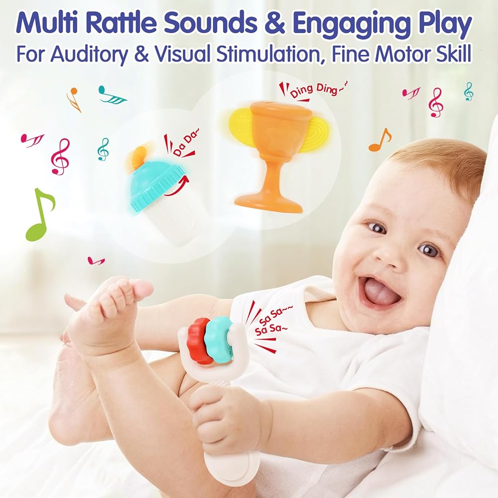 🎶 أصوات خشخيشة متعددة ولعب جذاب: تتميز كل خشخشة أطفال بأصوات مختلفة، مثل الهز والتدوير والضغط، لتحفيز التطور السمعي وإبقاء الأطفال مستمتعين. تساعد الألوان الزاهية والأصوات الجذابة على تطوير التتبع البصري والمهارات السمعية وتطوير المهارات الحركية الدقيقة.