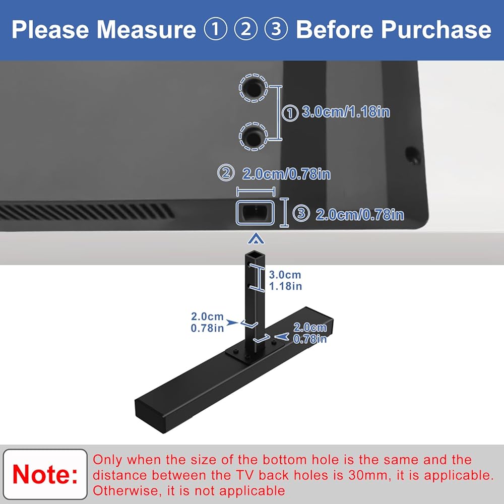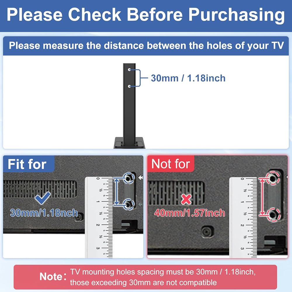 ---Compatibility Check--Before purchasing, please measure the TV hole spacing to ensure it meets the stand's hole spacing 30 mm/1.18 inch for a perfect fit and verify that your TV model is listed