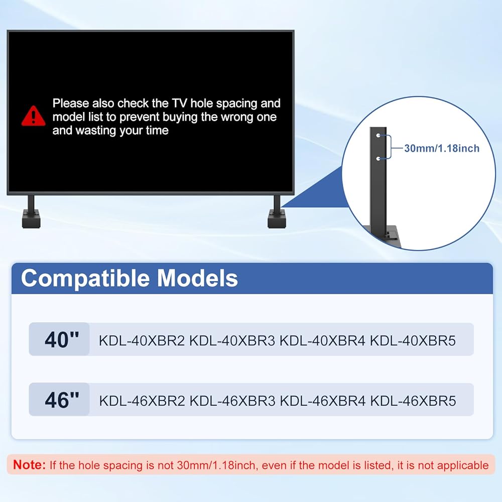 Tips: The TV stand is only applicable to the listed models for Sony Bravia TV. Before purchasing,please check your TV modle and measure the hole spacing of your TV. Make sure the hole spacing is 30mm/1.18 inch