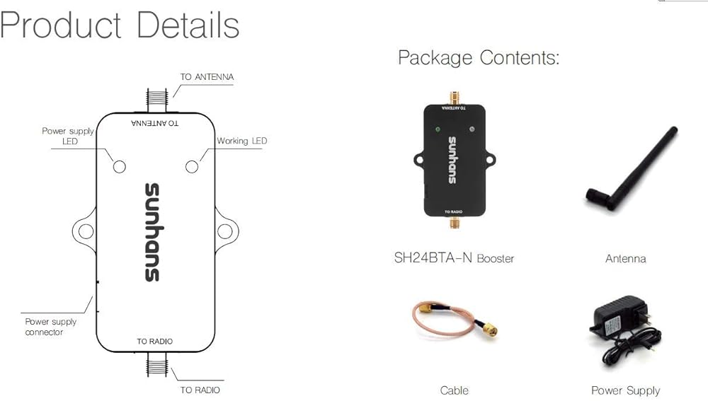 Sunhans 2.4GHz wifi signal booster, Max. 3000mW output power, it be made for Aluminum-alloy case by CNC and can anti interference , Small size, Safe & Power saving. Full kit, easy to install, including antenna, power plug and cable, nothing to worry about the compatibility of other accessories. Simply plug and play, no software is required. For house, office, UAV, IP cameras, Bluetooth ,RC equipment....