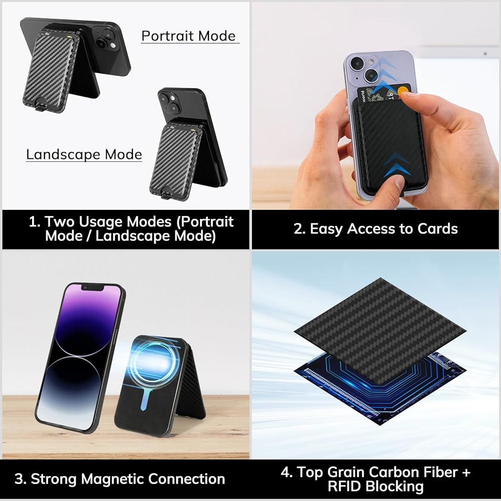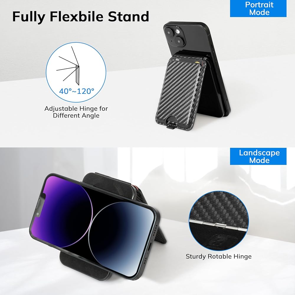 محفظة مغناطيسية مع حامل هاتف متوافق مع iPhone: حامل بطاقة مغناطيسية مع حامل قابل للتعديل - محفظة جلدية من ألياف الكربون وحامل هاتف لسلسلة iPhone 15/14/13/12