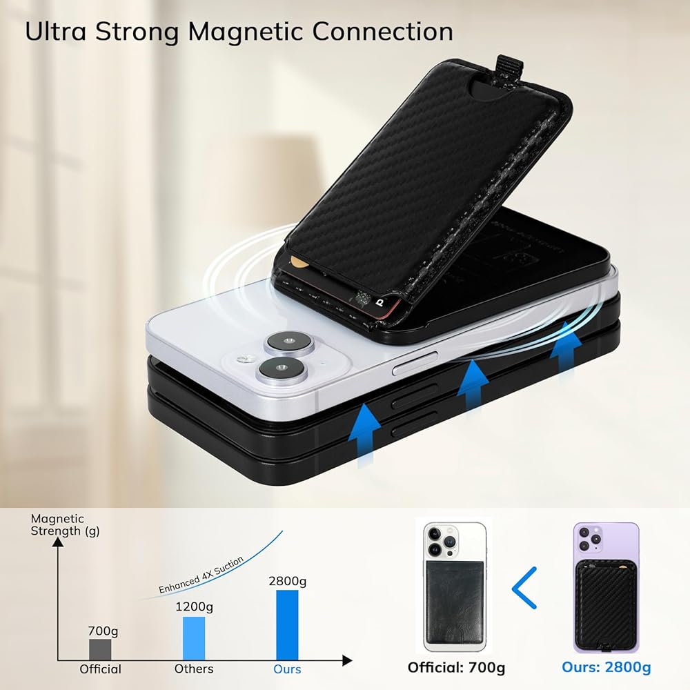 مغناطيسات قوية للغاية: يحتوي حامل البطاقة والمحفظة على مغناطيس قوي يوفر اتصالاً قويًا بين المحفظة والمغناطيس المتوافق مع هاتف iPhone، والمغناطيسات القوية أقوى بنسبة 70% من المحفظة المغناطيسية الرسمية لضمان بقاء حامل محفظتك مثبتًا بشكل آمن.