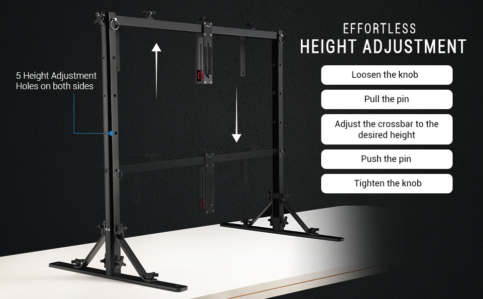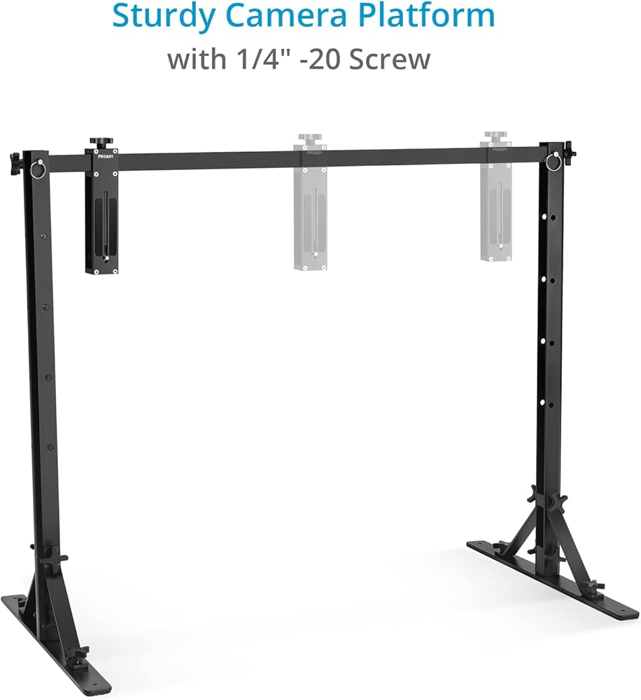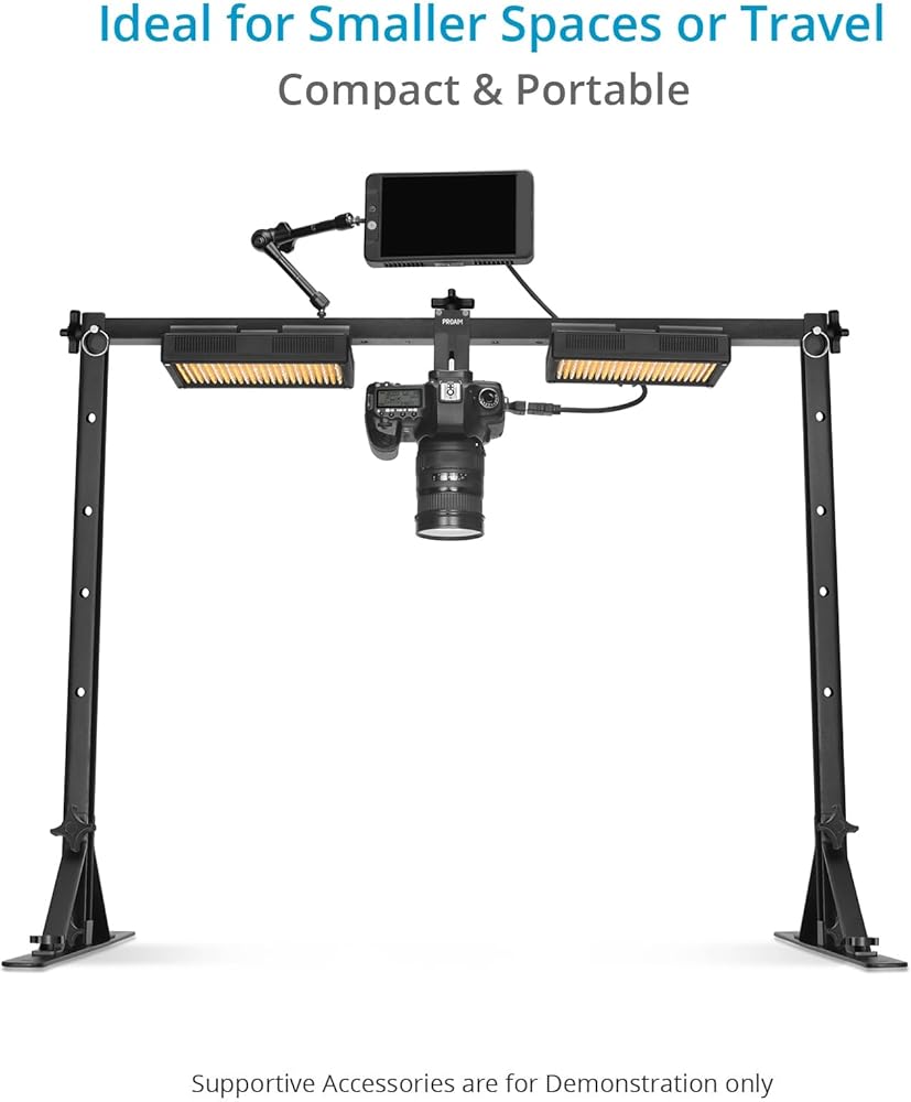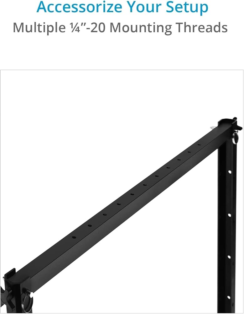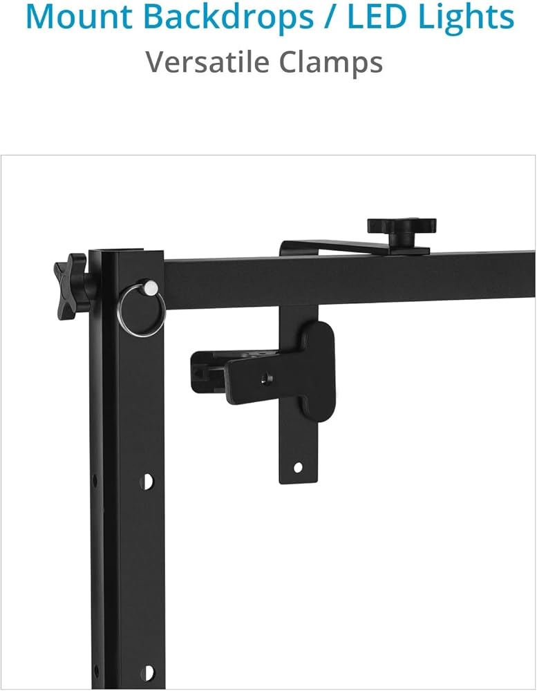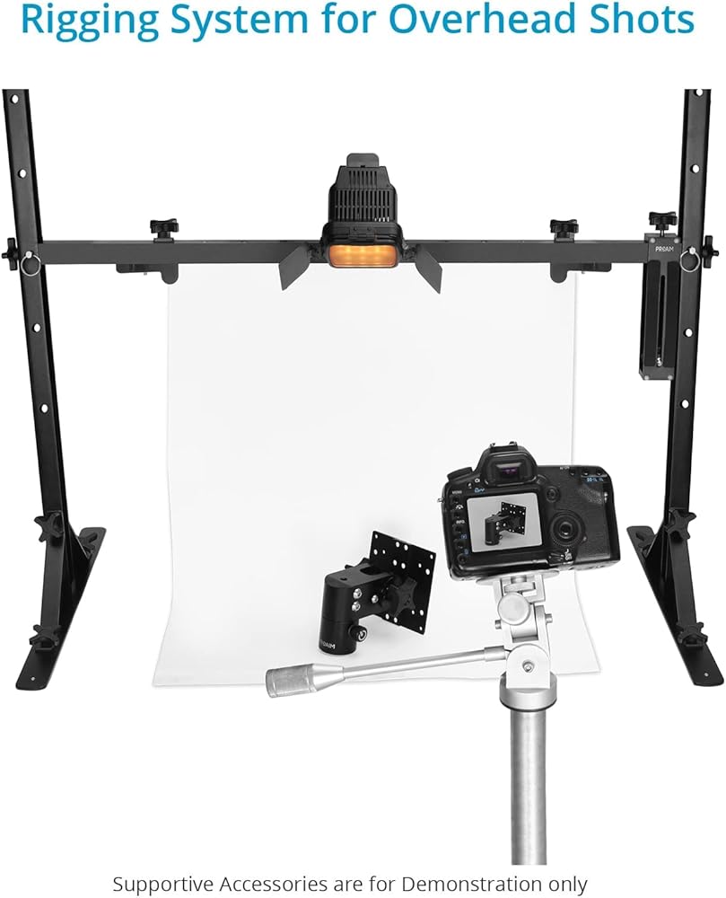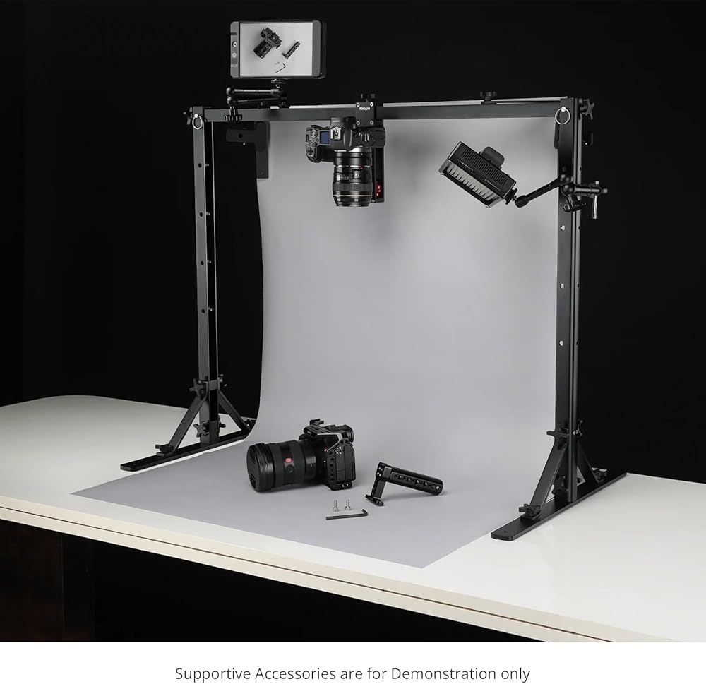 يمكن قفل حامل الكاميرا مع برغي ¼ بوصة - 20 في أي موضع على العارضة؛ مشبكان لحمل الخلفيات، ومصابيح LED للاستوديو، وما إلى ذلك
