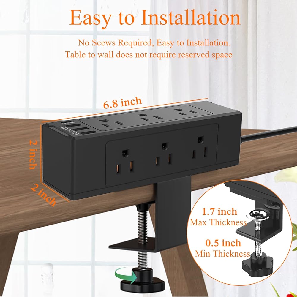 【Detachable Versatile Plug】This travel power strip have 3 install ways mean you can use the flat head power strip where you need. It can clamps onto of your desk(The Max Edge Thickness is 1.7Inch), clamp is detachable, you can remove the clamp and hang it on the wall ( with mounted holes) or directly use on desk.