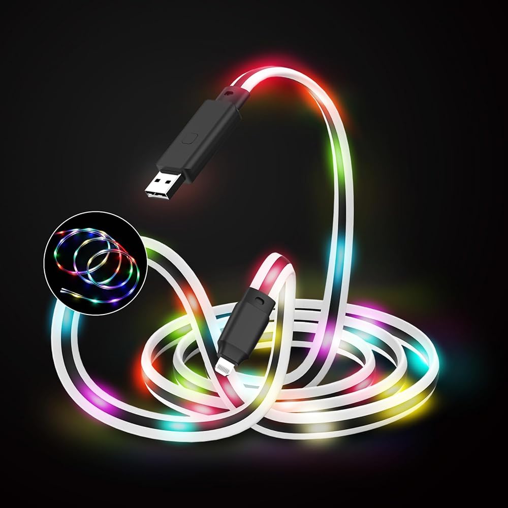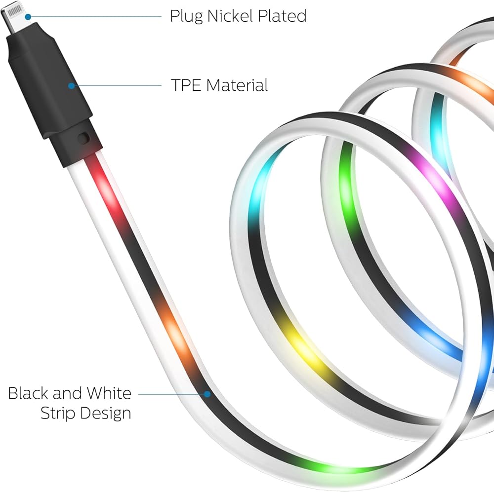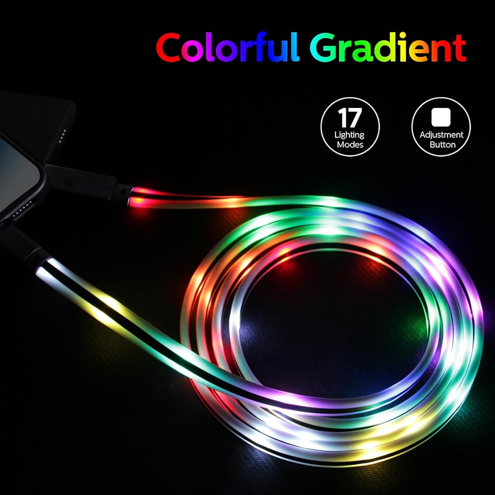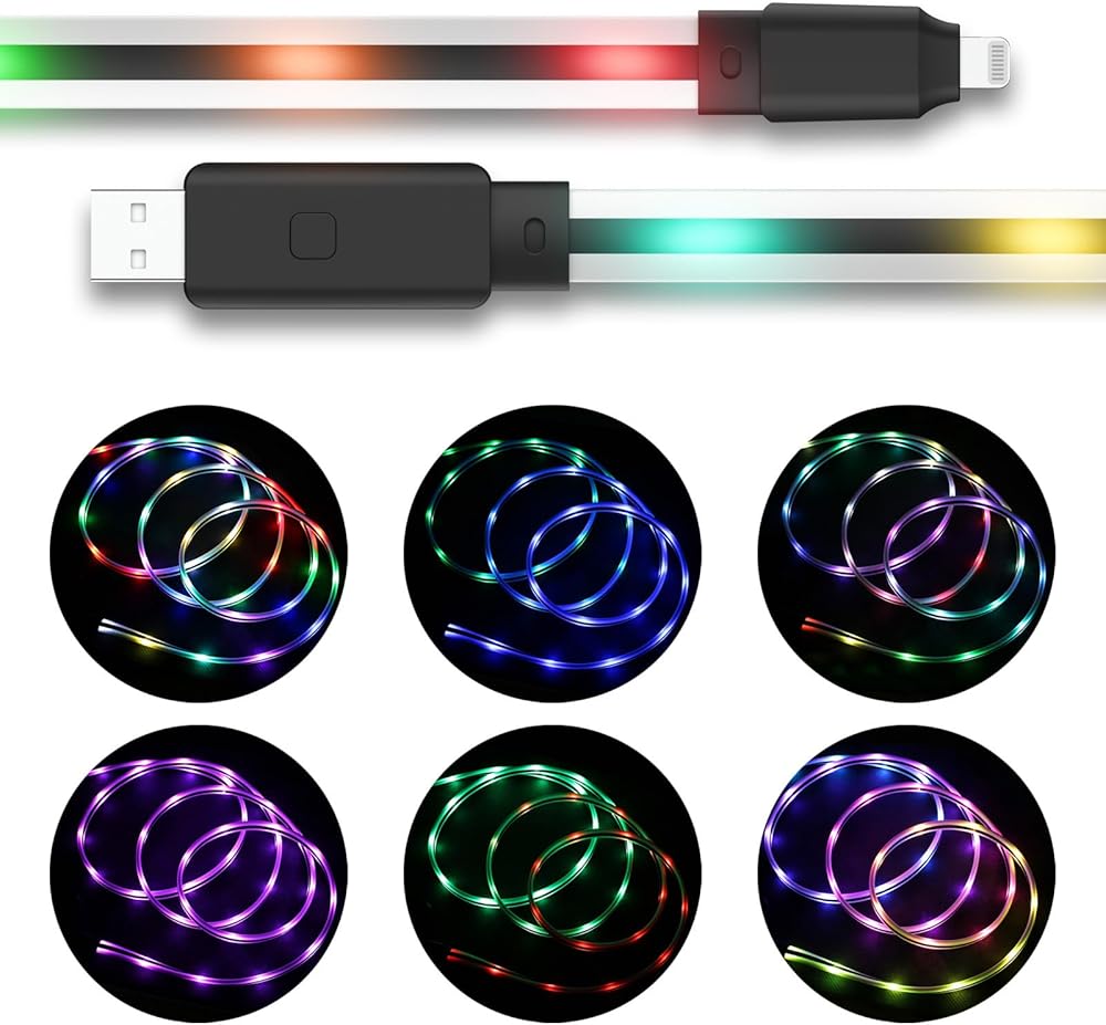 كابل Apple متغير اللون: تشغيل/إيقاف، يمكنك ضبط 17 وضع إضاءة (مختلط، مموج، متسلسل، توهج بطيء، فلاش، بهتان بطيء، وميض وثابت). يحتوي كل وضع إضاءة على إجمالي 8 ألوان، وهي الأبيض والأحمر والبرتقالي والأخضر والأزرق والأرجواني والأزرق والأصفر، اضبط وضع الإضاءة عبر الزر الأسود الصغير في نهاية الكابل.