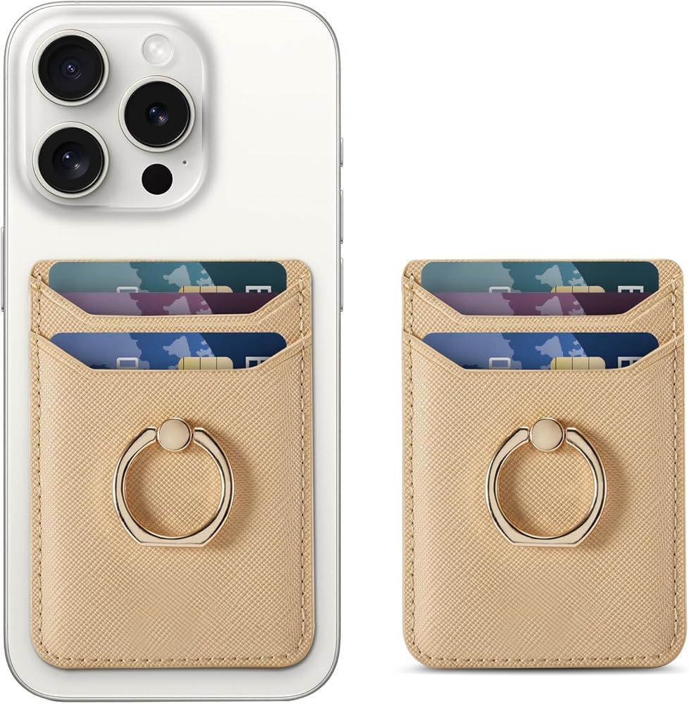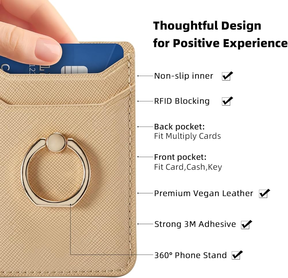 حامل بطاقة الائتمان لحافظة الهاتف، مرفق محفظة لاصقة RFID لحافظة الهاتف مع حامل حلقة الإصبع على معظم الهواتف الذكية لهواتف iPhone وGalaxy وGoogle، جلد نباتي ذهبي