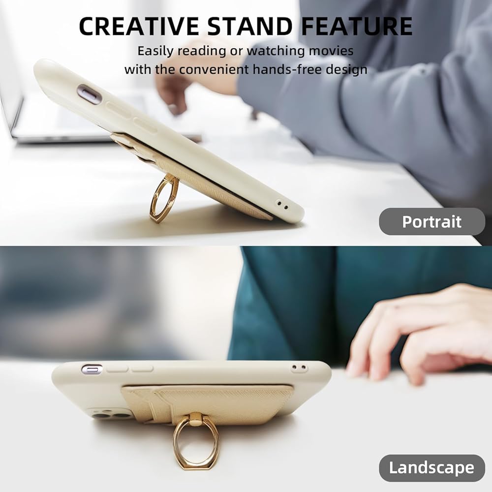 • 360 swivel ring on back : you can put your finger through this ring and have more stability and comfortable when you're holding your phone,and no worry about sag or pulled at the cards. It also helps to prop your phone up in a slew of different ways, great for standing up the phone when taking pictures with the timer also watching video.
