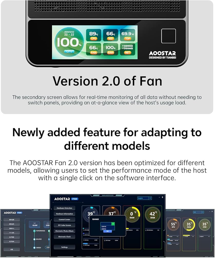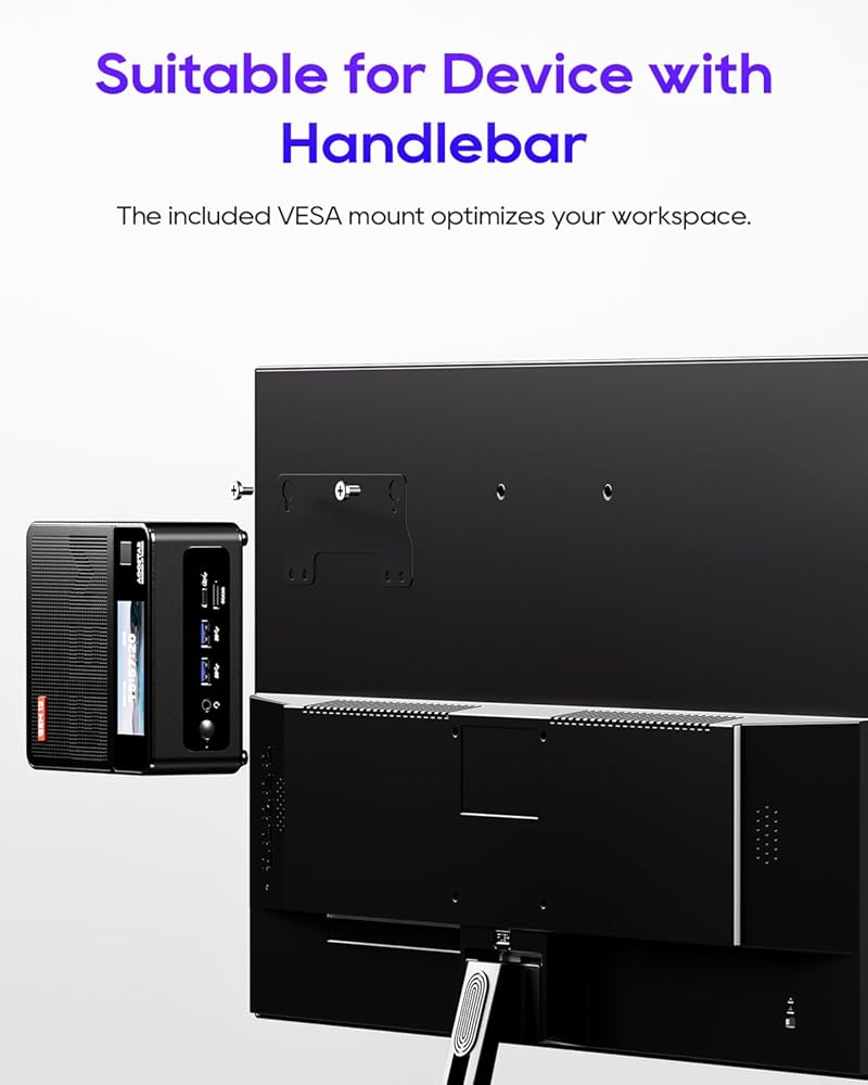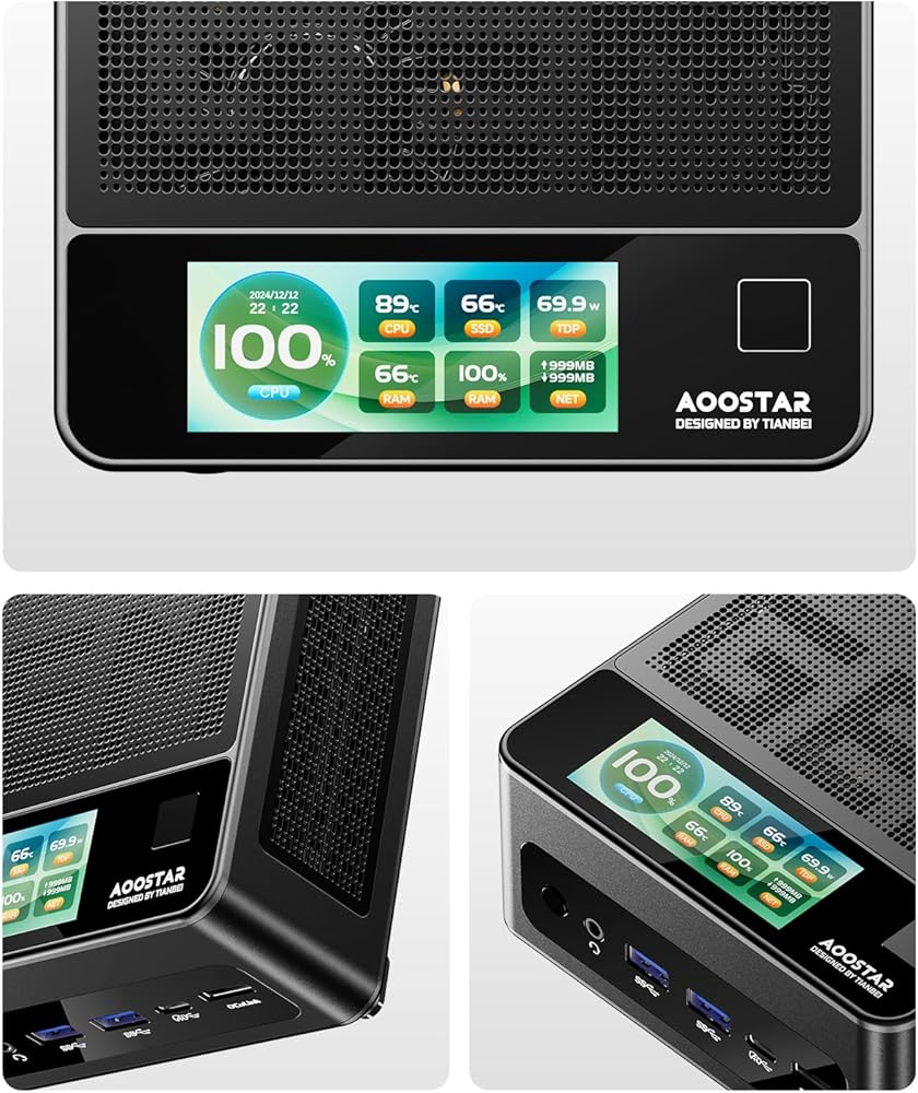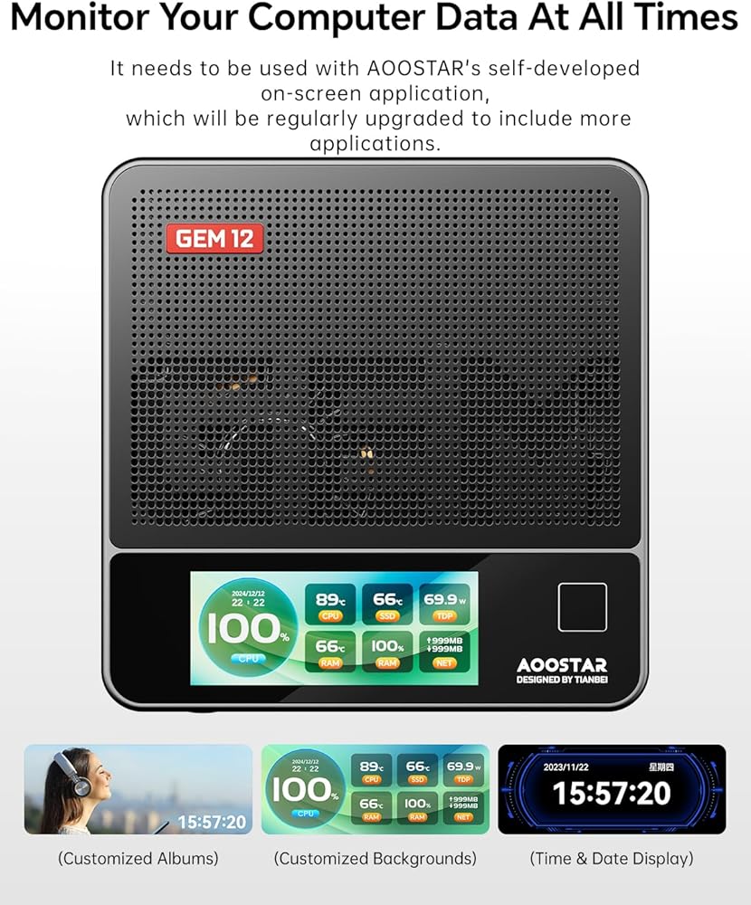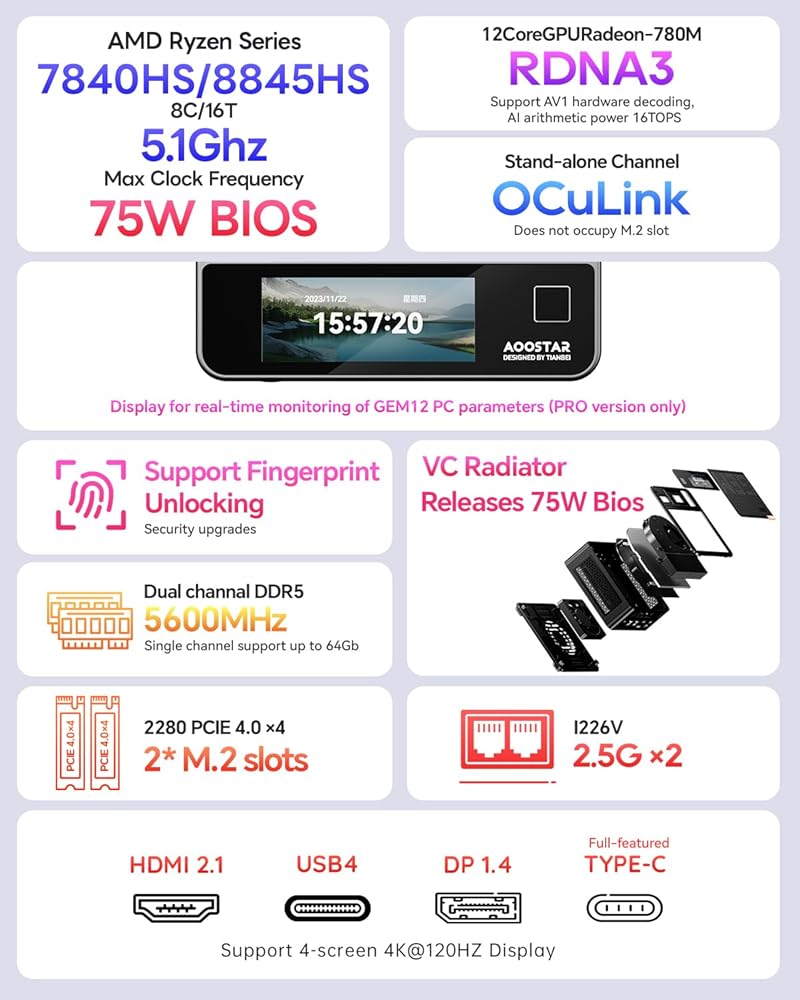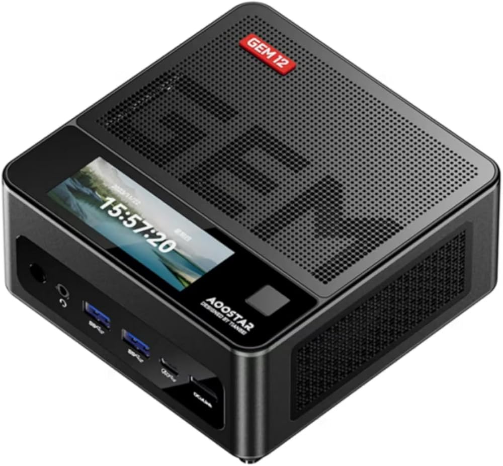 تشمل جميع العبوات ما يلي: 1 × كمبيوتر صغير AOOSTAR GEM12 8845HS، 1 × حامل VESA، 1 × برغي تثبيت، 1 × مصدر طاقة، 1 × كابل HDMI، 1 × وسادة تبريد SSD