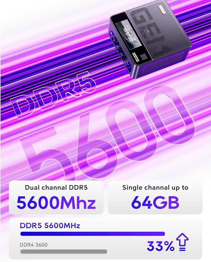 وحدة المعالجة المركزية AMD Ryzen 7 8845HS؛ 8C/16T حتى 5.1 جيجا هرتز؛ AMD Radeon 780M Graphics تردد رسومات 2700 ميجا هرتز؛ أداء الذكاء الاصطناعي يصل إلى 16 TOPS؛ يدعم فك تشفير AV1. لاحظ أن هذا الرابط مخصص للإصدار بدون شاشة