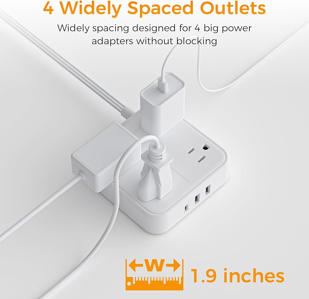 شريط طاقة سطح المكتب 4 في 1: يمكن لسلك التمديد هذا ذو المنافذ المتعددة تحويل مقبس واحد إلى 4 منافذ تيار متردد، ويتم فصل منافذ التيار المتردد المتباعدة على نطاق واسع بما يكفي لتناسب 4 مقابس كبيرة دون حجب بعضها البعض، مما يحافظ على سطح المكتب الخاص بك منظمًا؛ يمكنك استخدامه في أي مكان داخلي مثل المنزل والمكتب وغرفة النوم