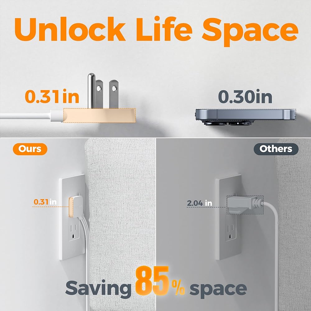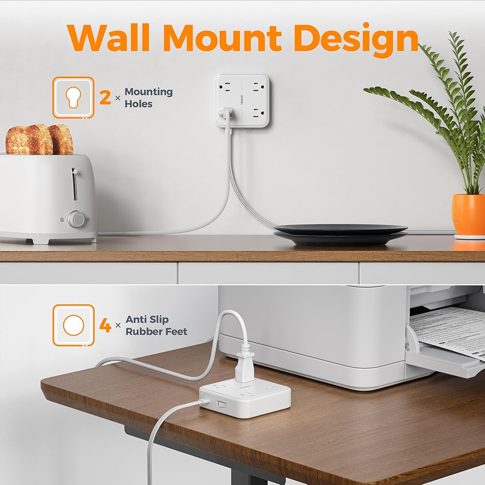 سلك تمديد للقابس المسطح: مع تصميم رأس مسطح رفيع للغاية يبلغ 0.31 بوصة فقط، يمكن لقابس الحائط المسطح المنخفض الحجم من TESSAN أن يتلاءم بسهولة مع الأماكن الضيقة والاختباء خلف الأريكة أو السرير أو المنضدة أو أي أثاث آخر، ويجلس على الحائط؛ تصميم زاوية يمنى 45 درجة يخلق مساحة إضافية للقابس الآخر بالأسفل دون حجب