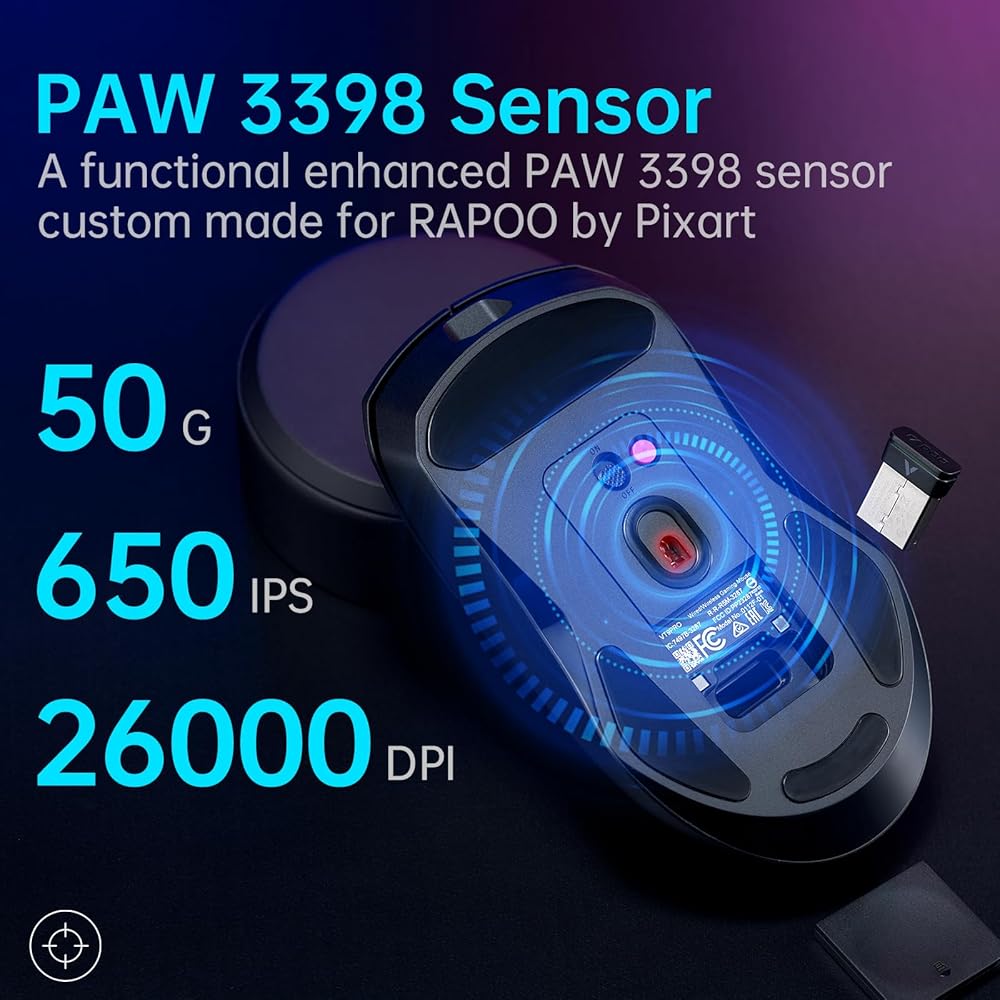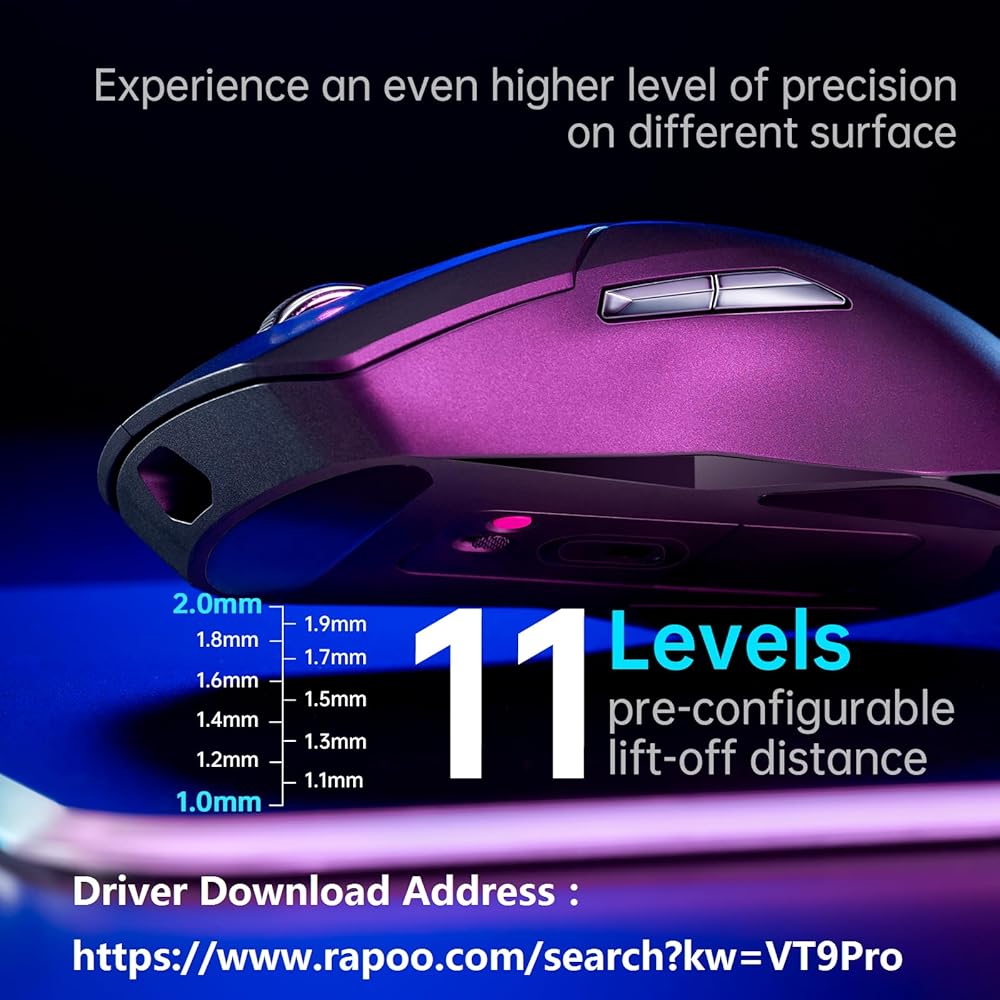 • 🎮ماوس الألعاب اللاسلكي الاحترافي من فئة ESPORTS: مغير قواعد اللعبة الذي لا يعيقك بأي شكل من الأشكال. يستخدم ماوس الألعاب Rapoo VT9Pro مستشعر Pixart PAW 3398 المتقدم، مع 650 IPS، قابل للتعديل 50-26000 نقطة لكل بوصة، وتسريع 50 جيجا. يحتوي الماوس على 11 مستوى من مسافة الإقلاع القابلة للتكوين مسبقًا لتكييف منصات الماوس المختلفة وتوفير دقة أكبر. يمكنه متابعة اليد بسلاسة والتقاط كل خطوة دقيقة من العملية بسرعة ودون فقدان الإطارات.