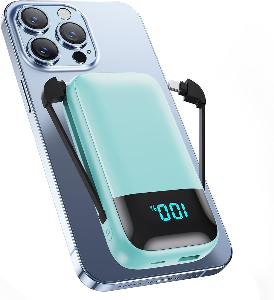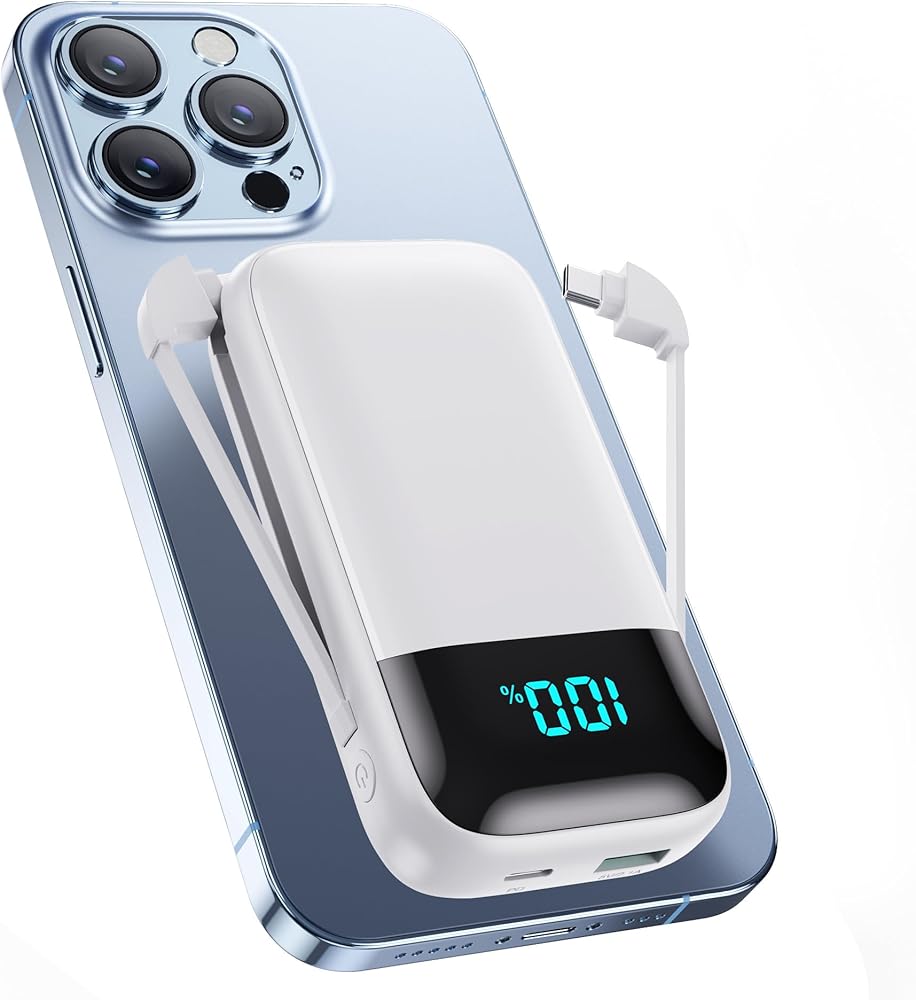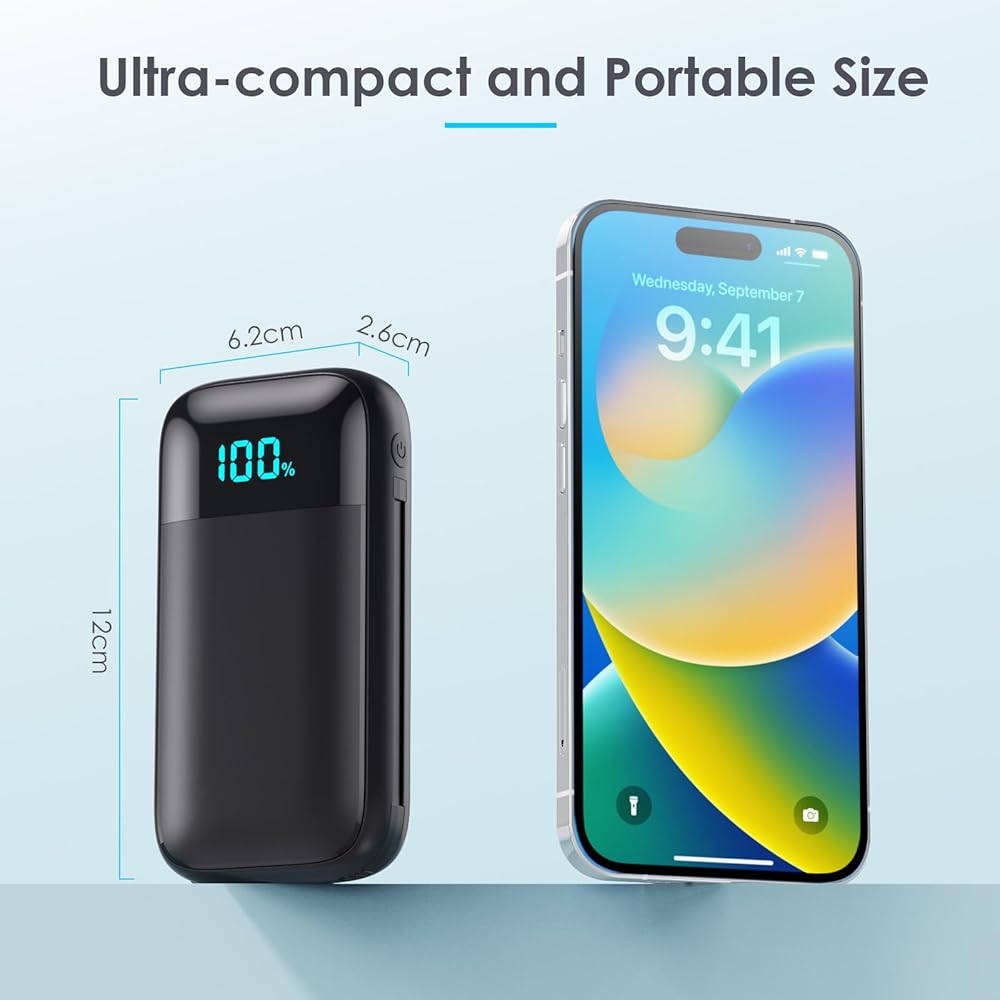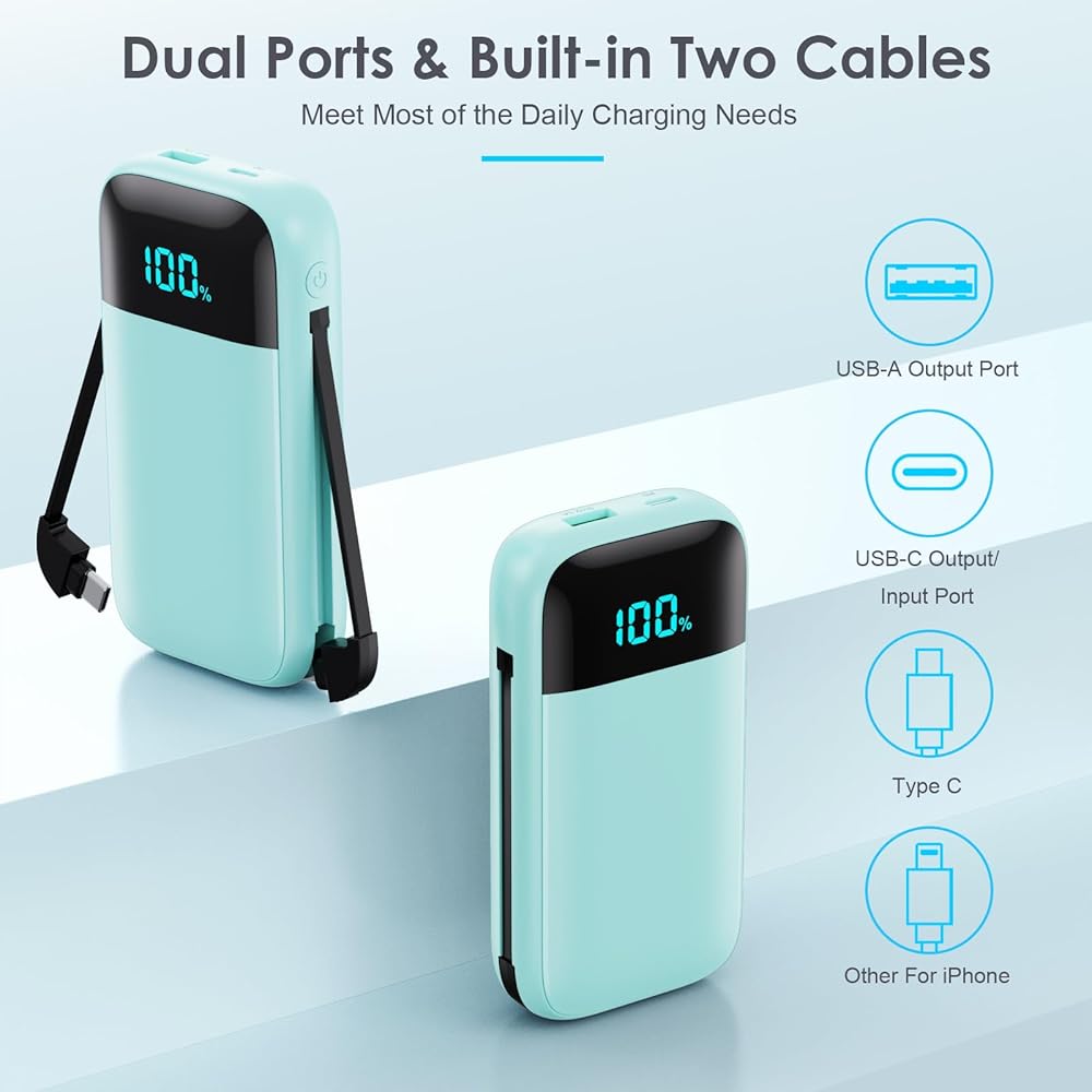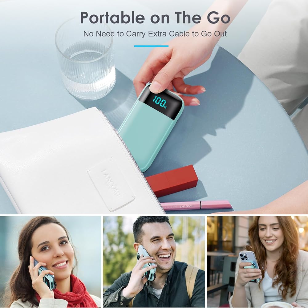 【شاحن محمول مع كابلات مدمجة】 شاحن محمول مدمج في كابلين شحن قابلين للطي، وكابل USB-C وكابل iPhone. يمكنك استخدام شاحن البطارية المحمول لشحن أجهزة iPhone وUSB-C Android الخاصة بك مباشرة دون أسلاك إضافية. حزمة بطارية رائعة للخروج أو السفر.