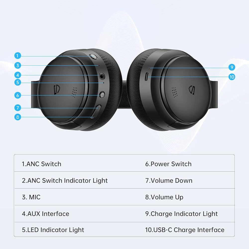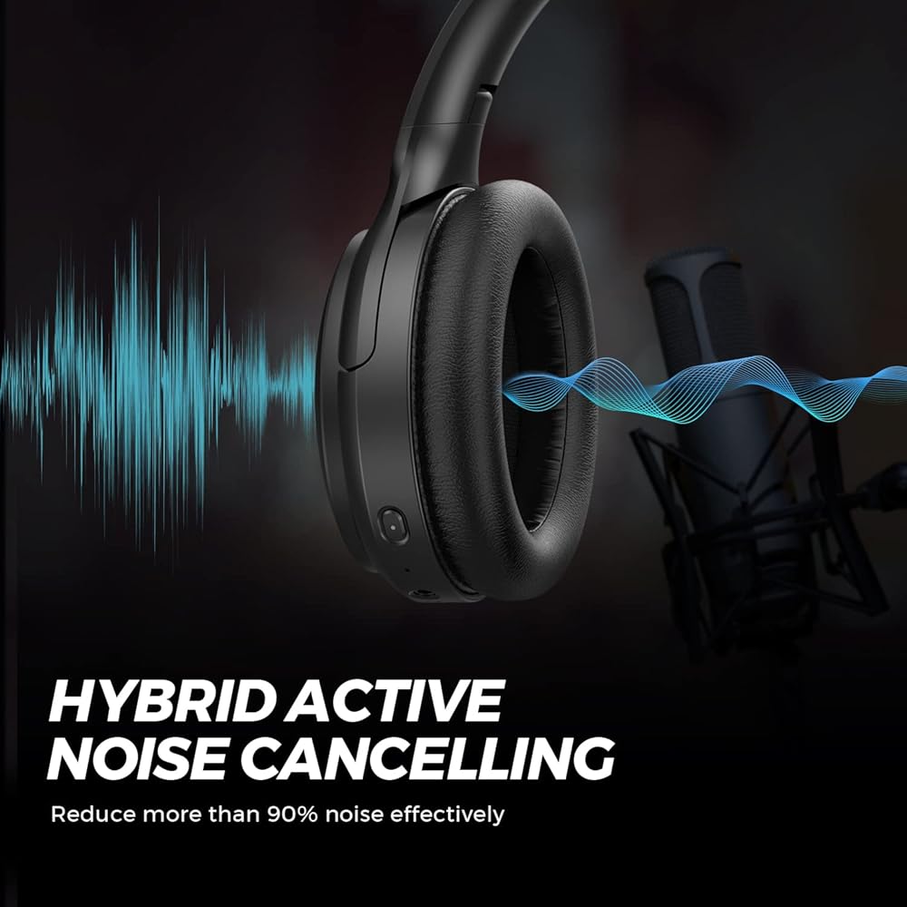 سماعات SoundPEATS A6 Hybrid النشطة المانعة للضوضاء، سماعات بلوتوث فوق الأذن اللاسلكية، صوت ممتاز، وقت تشغيل 38 ساعة، أغطية أذن من إسفنج الذاكرة، تصميم قابل للطي للسفر والمنزل والمكتب
