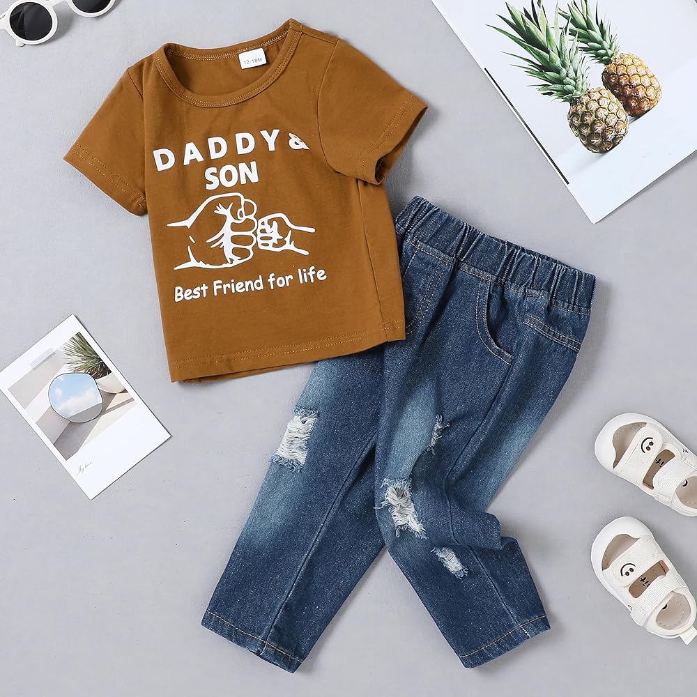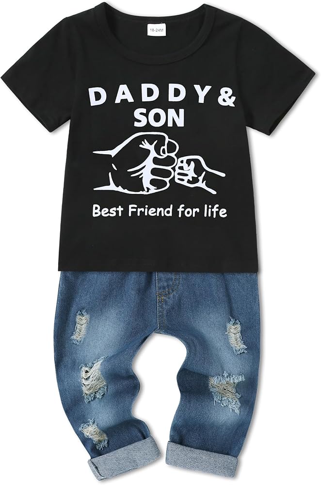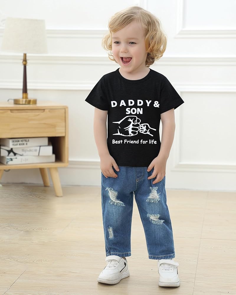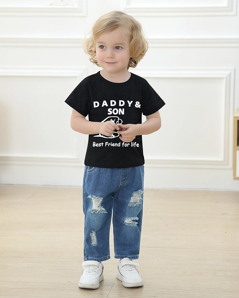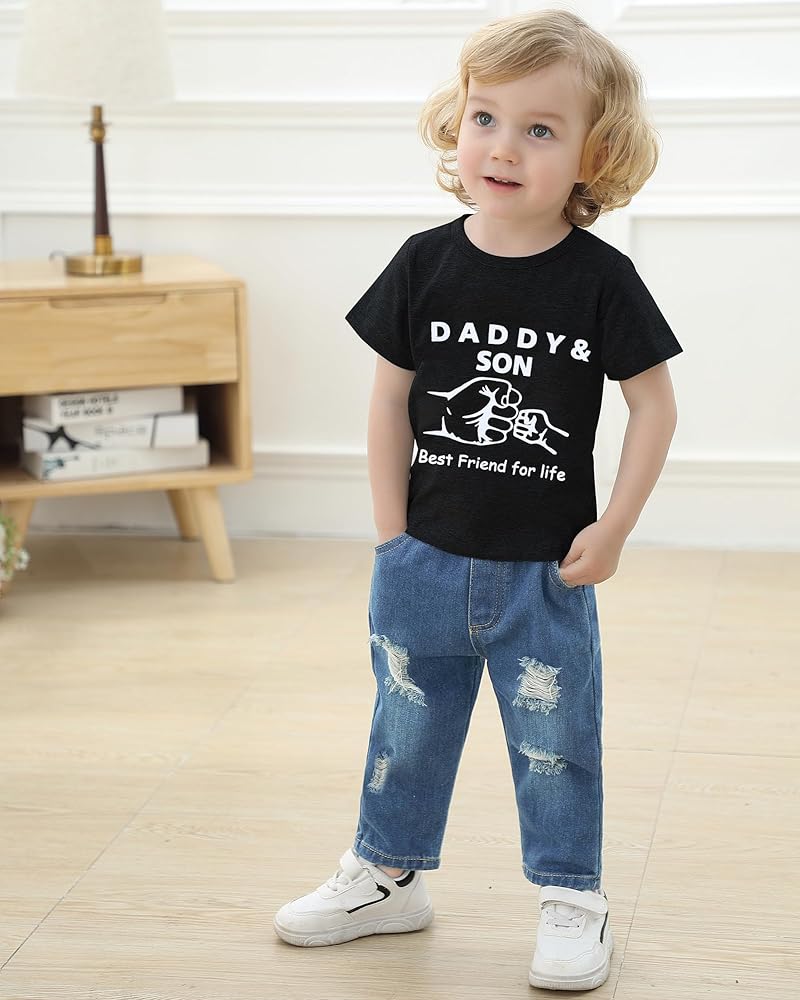 مميزات التصميم: المطبوعتان الموجودتان على التيشيرتات قصيرة الأكمام للأطفال الصغار رائعة وممتعة! تظهر طبعة "COOLER VERSION OF DAD" العلاقة الممتعة بين الابن والأب، بينما تعبر طبعة "DADDY & SON Best Friend for life" عن الصداقة العميقة بين الأب والابن. سيبدو طفلك الصغير أكثر وسامة وسحرًا، مع بنطال جينز ممزق أنيق. يعتبر زي الطفل الرضيع هذا مثاليًا للتجمعات العائلية أو لقضاء بعض الوقت الجيد مع الأب!