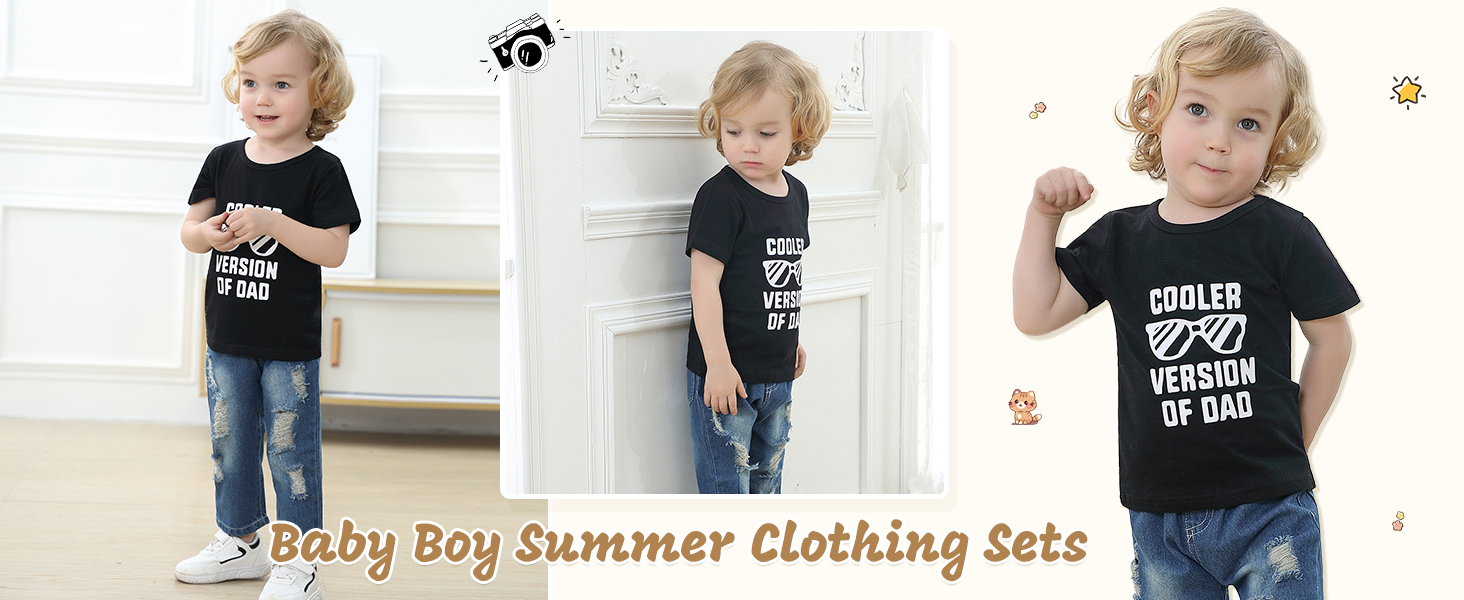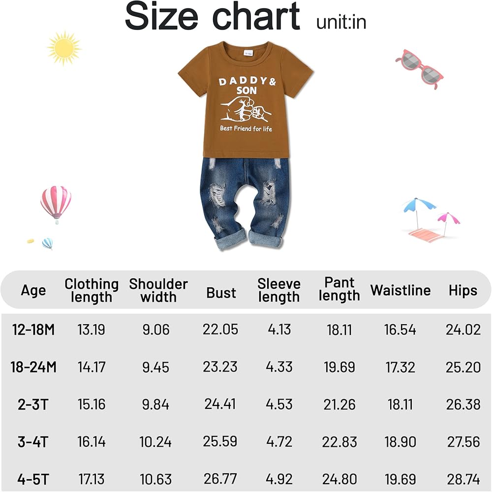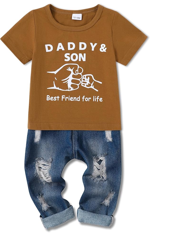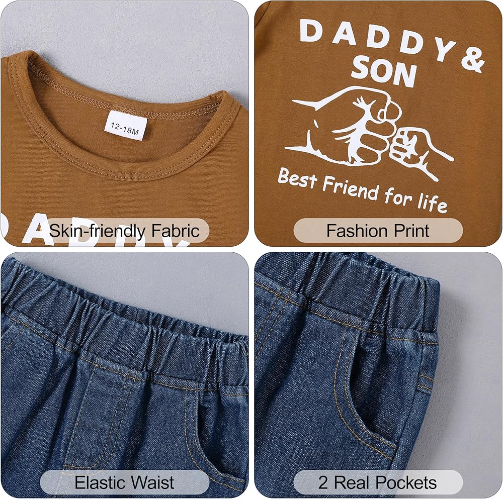 مميزات التصميم: المطبوعتان الموجودتان على التيشيرتات قصيرة الأكمام للأطفال الصغار رائعة وممتعة! تظهر طبعة "COOLER VERSION OF DAD" العلاقة الممتعة بين الابن والأب، بينما تعبر طبعة "DADDY & SON Best Friend for life" عن الصداقة العميقة بين الأب والابن. سيبدو طفلك الصغير أكثر وسامة وسحرًا، مع بنطال جينز ممزق أنيق. يعتبر زي الطفل الرضيع هذا مثاليًا للتجمعات العائلية أو لقضاء بعض الوقت الجيد مع الأب!