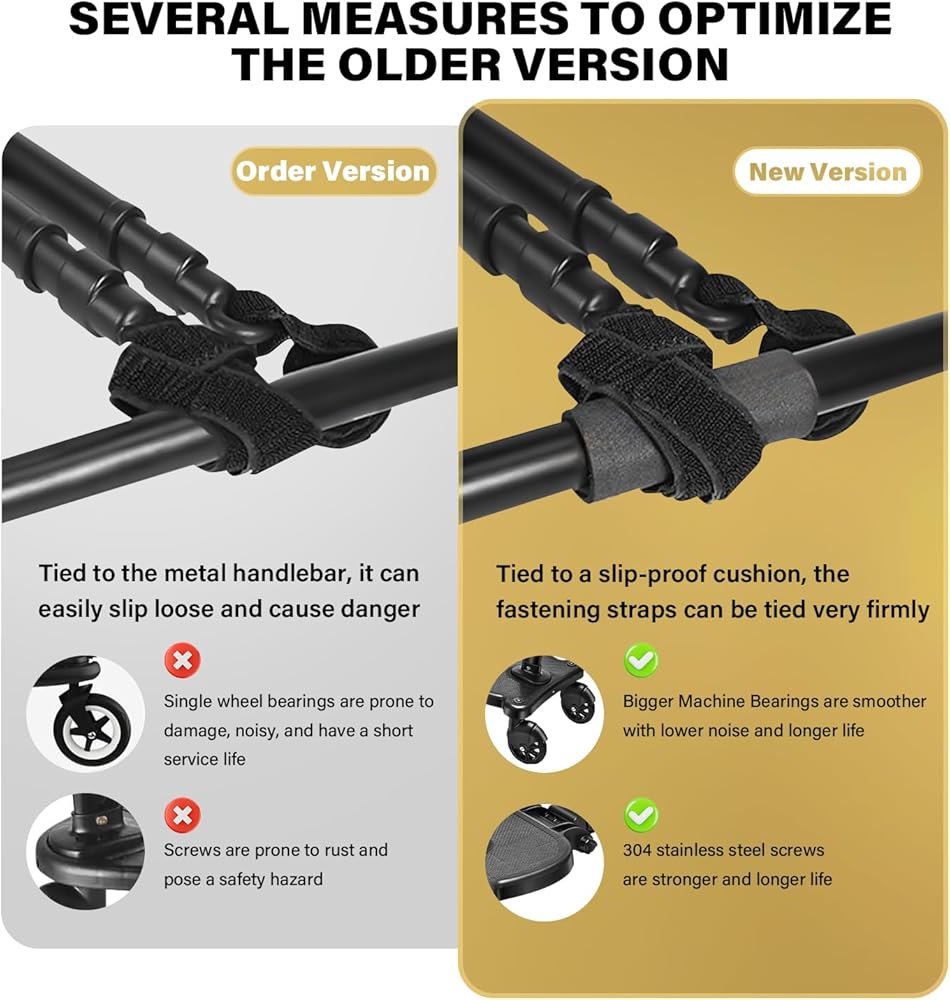 تحسين كبير: لقد قمنا بإجراء تحسينات كبيرة في ثلاثة جوانب: اتصال فيلكرو فائق، وزر دوار لضبط الزاوية الأفقية للدواسة، وقضبان توصيل قابلة للتعديل وفقًا لعرض عربات الأطفال.
