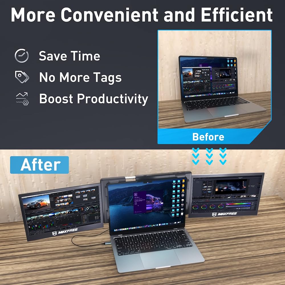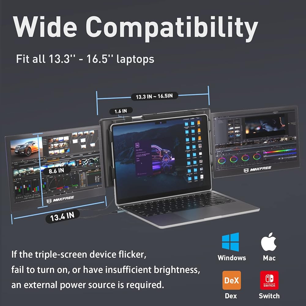 عزز إنتاجيتك: أطلق العنان لإمكاناتك الإنتاجية باستخدام شاشة Maxfree ثلاثية الشاشات، أو قم بمهام متعددة أو راقب كل شيء بسلاسة. وهو متوافق مع أجهزة الكمبيوتر المحمولة التي يتراوح حجمها من 13.3 إلى 16.5 بوصة، وهو مثالي لمتعددي المهام واللاعبين والمبرمجين ومحترفي المال والاستثمار والمصممين وأي شخص يحتاج إلى سير عمل أكثر كفاءة.