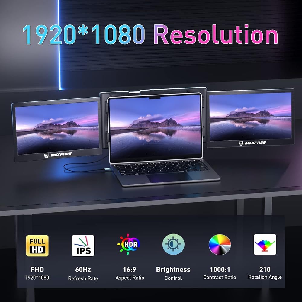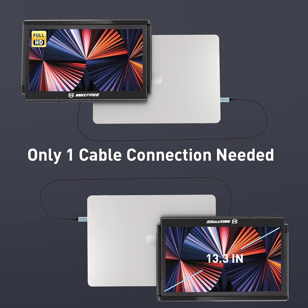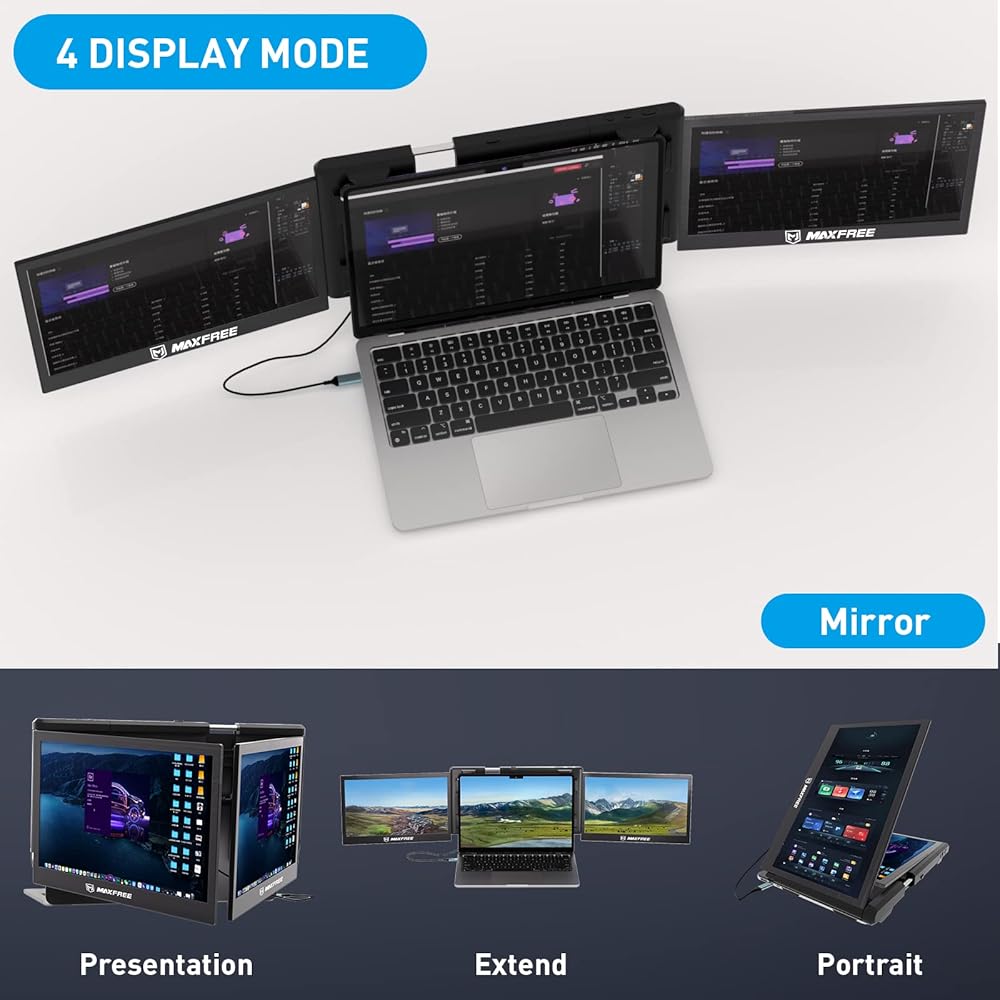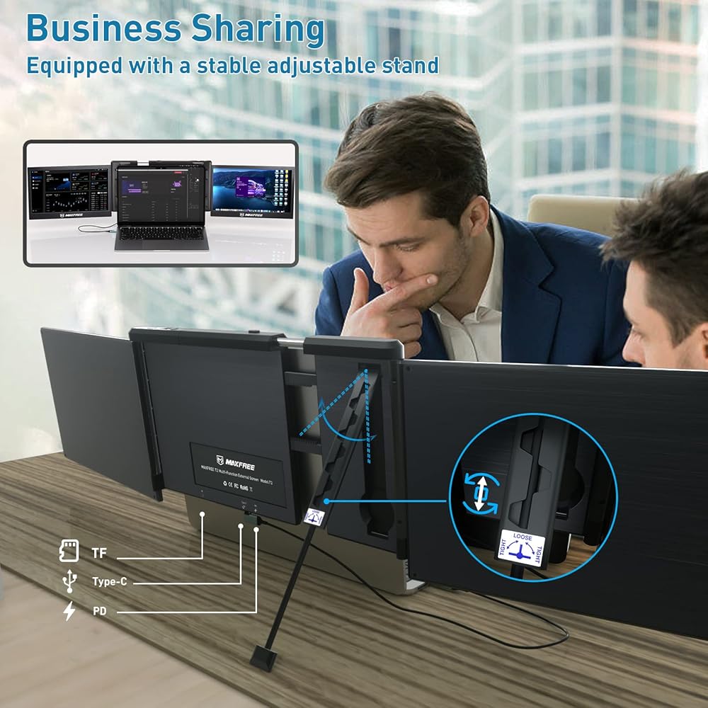 يمكنك تحقيق أقصى قدر من البساطة والراحة مع شاشة Maxfree T2 Triple المحمولة. فهو يتطلب اتصال كبل واحد فقط (تأكد من أن أجهزة الكمبيوتر المحمولة توفر طاقة أكبر من 5 فولت/2 أمبير) للإعداد الخالي من المتاعب. بفضل أربعة أوضاع للعرض ودعامة متينة، يمكنك ضبط زاوية الشاشة بسهولة حتى 210 درجة لإنشاء بيئة العمل المثالية.