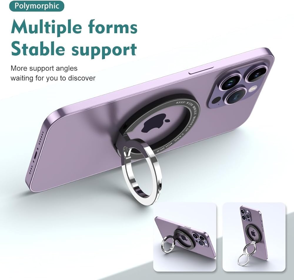【حامل وحامل قابلان للتعديل】لا يمكن للحلقة الداخلية لمقبض الهاتف الدائري المغناطيسي أن تدور بحرية 360 درجة فحسب، بل تقلب أيضًا 90 درجة، مما يسمح لك باستخدامها كحامل بسيط مع تعديلات متعددة الزوايا. سواء كنت تلتقط صورًا، أو تجري مكالمات فيديو، أو تحتاج ببساطة إلى حل بدون استخدام اليدين، فإن حامل حلقة الإصبع هذا من magsafe يوفر لك كل ما تحتاجه.