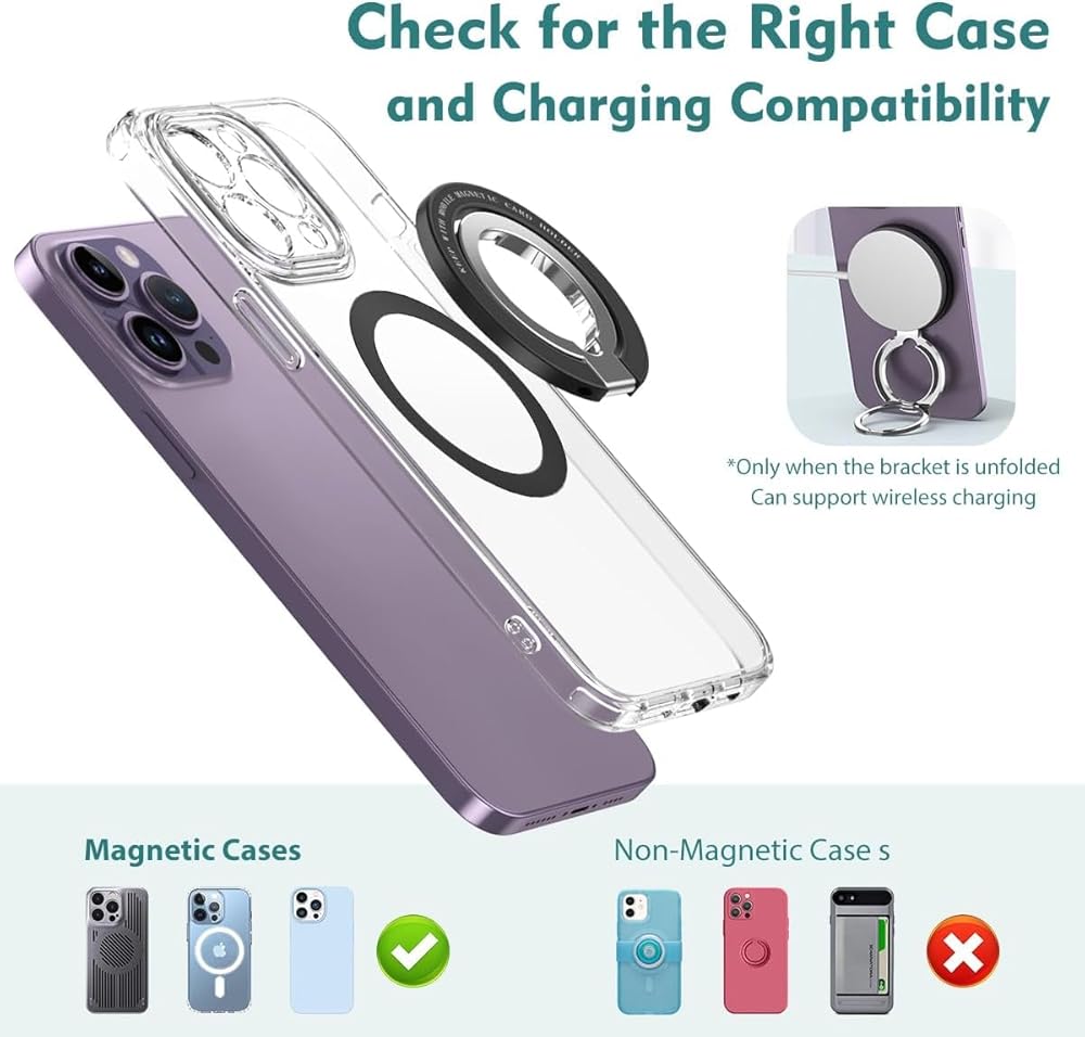 【يرجى العلم بذلك】1. يرجى إزالة حامل حلقة الهاتف المغناطيسي للشحن اللاسلكي. 2. تأكد من إزالة المقبض الدائري للهاتف عن طريق تحريكه جانبًا لمنع الحلقات المعدنية (في حالة وضعها) من السقوط. 3. لا تتداخل حلقة MagSafe المرفقة مع الشحن اللاسلكي، ومع ذلك، تأكد من المحاذاة الصحيحة مع ملف الشحن الخاص بهاتفك لتجنب أي انقطاع في الشحن اللاسلكي.