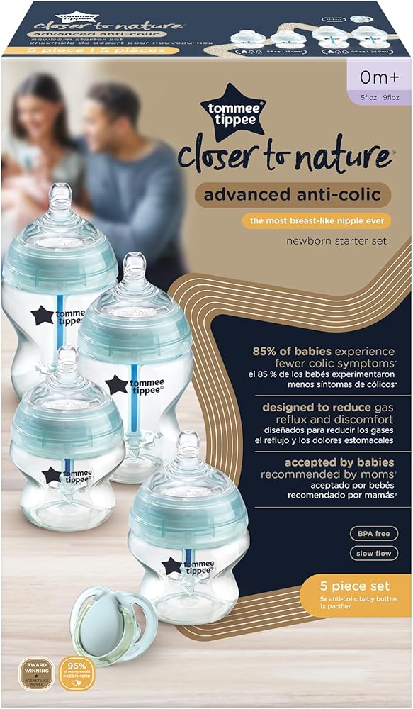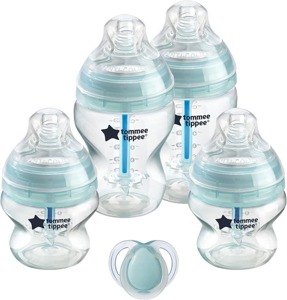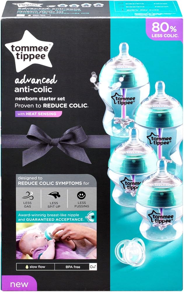 There's nothing a parent wants more than for their baby to be comfortable, that's why we've combined our award-winning breast-like nipple with the latest anti-colic innovation to create the Tommee Tippee Advanced Anti-Colic bottle. This is no ordinary baby bottle. It works a little differently from regular bottles to help combat colic, while ensuring a comfortable feeding experience for you and your baby. The unique venting system draws air away from milk, meaning 80% less gas*, and 100% more smiles! Plus, a built-in heat-sensing strip gives extra reassurance that your milk is just the right temperature. Helping you Parent On This Newborn Essentials Set contains: 2x 9oz AAC Bottles 2x 5oz AAC Bottles 1x 0-3M Everyday Pacifier 2x valve cleaning brushes Instruction leaflet * When we asked 210 parents who tried using this product to reduce their child's colic symptoms, 80% agreed the bottle had successfully reduced the symptoms (June 2017).
