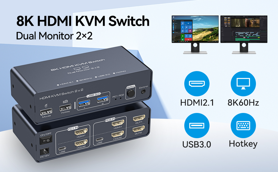 【Ultra HD 8K@60HZ】يدعم مفتاح kvm للشاشة المزدوجة دقة تصل إلى 8K@60 هرتز وهو متوافق مع 4K@120 هرتز، وثلاثي الأبعاد، و1080P@60 هرتز أو دقة أقل. استمتع بألوان نابضة بالحياة غير مسبوقة وتفاصيل رائعة، واستمتع بتجربة مشاهدة غامرة. عند تبديل مصادر الإشارة، تتعرف شاشات مفتاح kvm 2 تلقائيًا على دقة العرض. ملاحظة: لتحقيق أعلى دقة، يرجى التأكد من أن مصدر الإشارة والشاشة وكابل HDMI يدعمون 8K عند 60 هرتز.