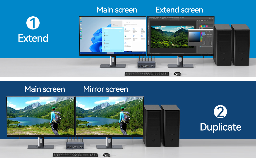 【شاشة KVM Switch 2 جهاز كمبيوتر】تسمح الشاشة المزدوجة لمفتاح kvm لجهازي كمبيوتر بمشاركة شاشتي عرض و4 منافذ USB، مثل الماوس ولوحة المفاتيح والطابعة وما إلى ذلك. كما أنها تدعم الأوضاع الموسعة والمكررة. في الوضع الممتد، يمكنك نقل بعض نوافذ التطبيقات من الشاشة الرئيسية إلى الشاشة المساعدة. في الوضع المكرر، ستخرج الشاشتان نفس الشاشة. ملاحظة: يمكن لـ USB C نقل البيانات فقط، يرجى التأكد من أن جهاز الكمبيوتر الخاص بك يحتوي على منفذي HDMI على الأقل.