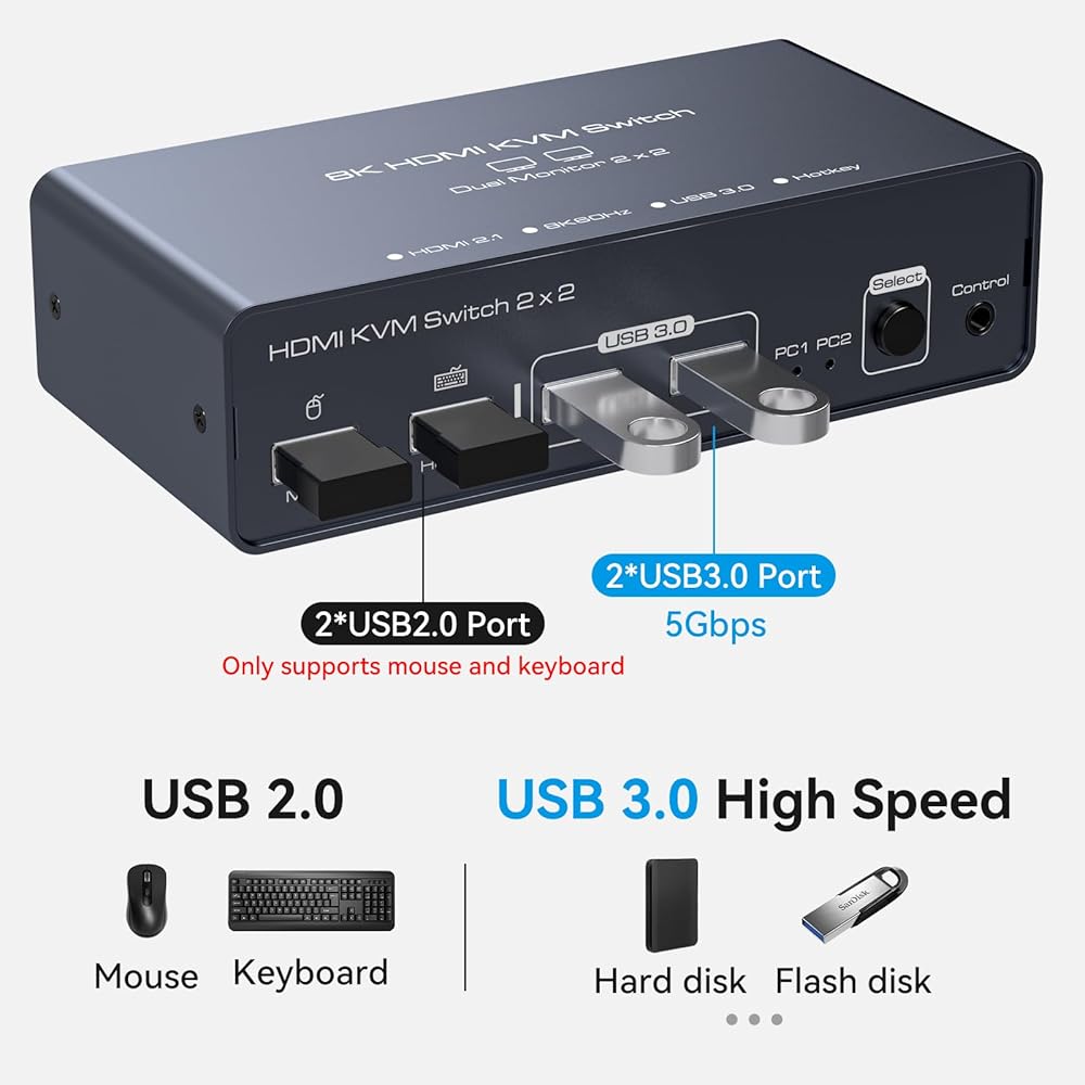 مفتاح KVM 2 شاشتين، 2 جهاز كمبيوتر 8K60 هرتز 4K120 هرتز، مفاتيح KVM، HDMI KVM Switch شاشة مزدوجة تسمح لجهازي كمبيوتر بمشاركة شاشتين و4 أجهزة USB تدعم مفتاح التشغيل السريع (USB C غير مدعوم)