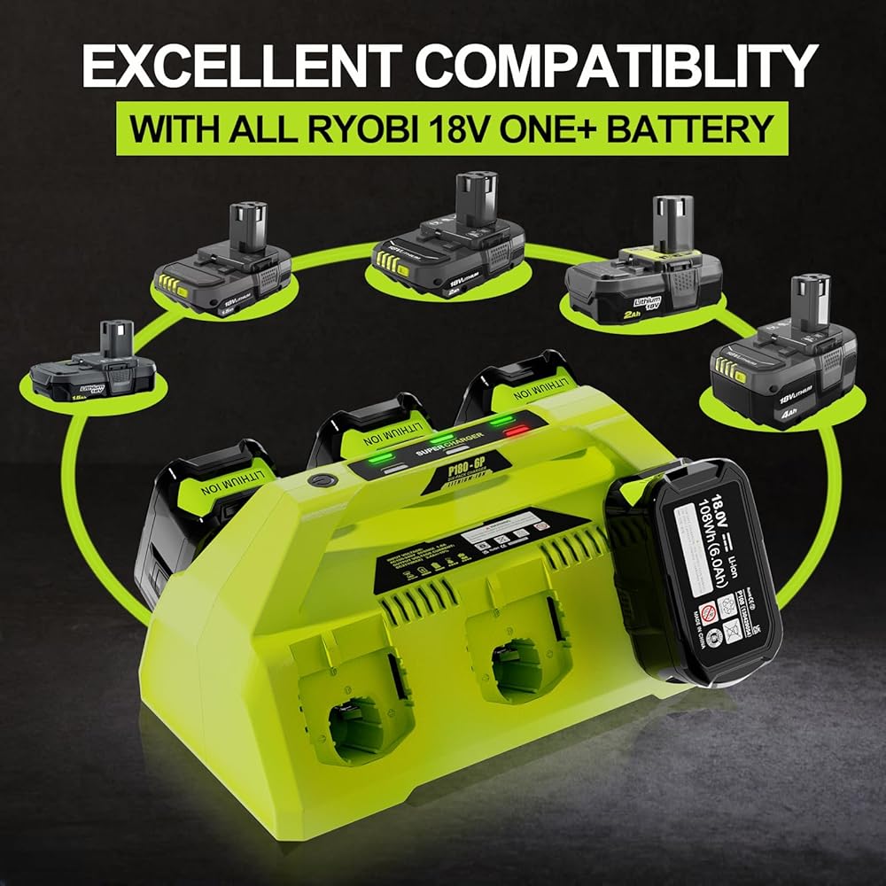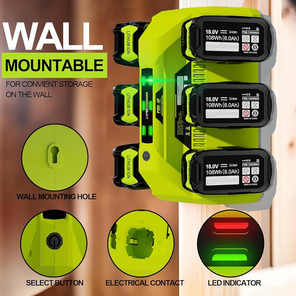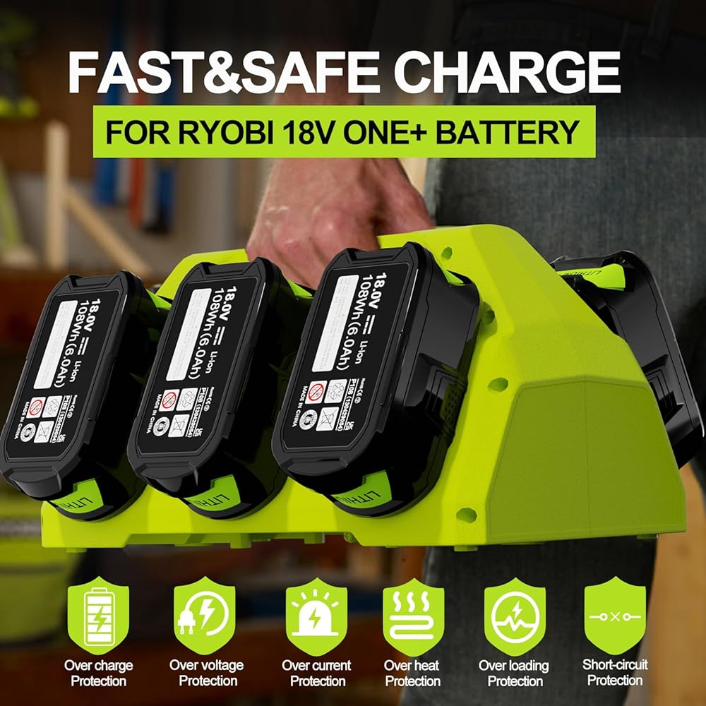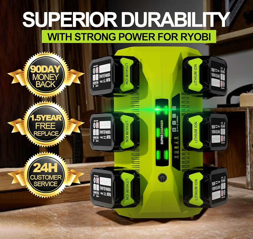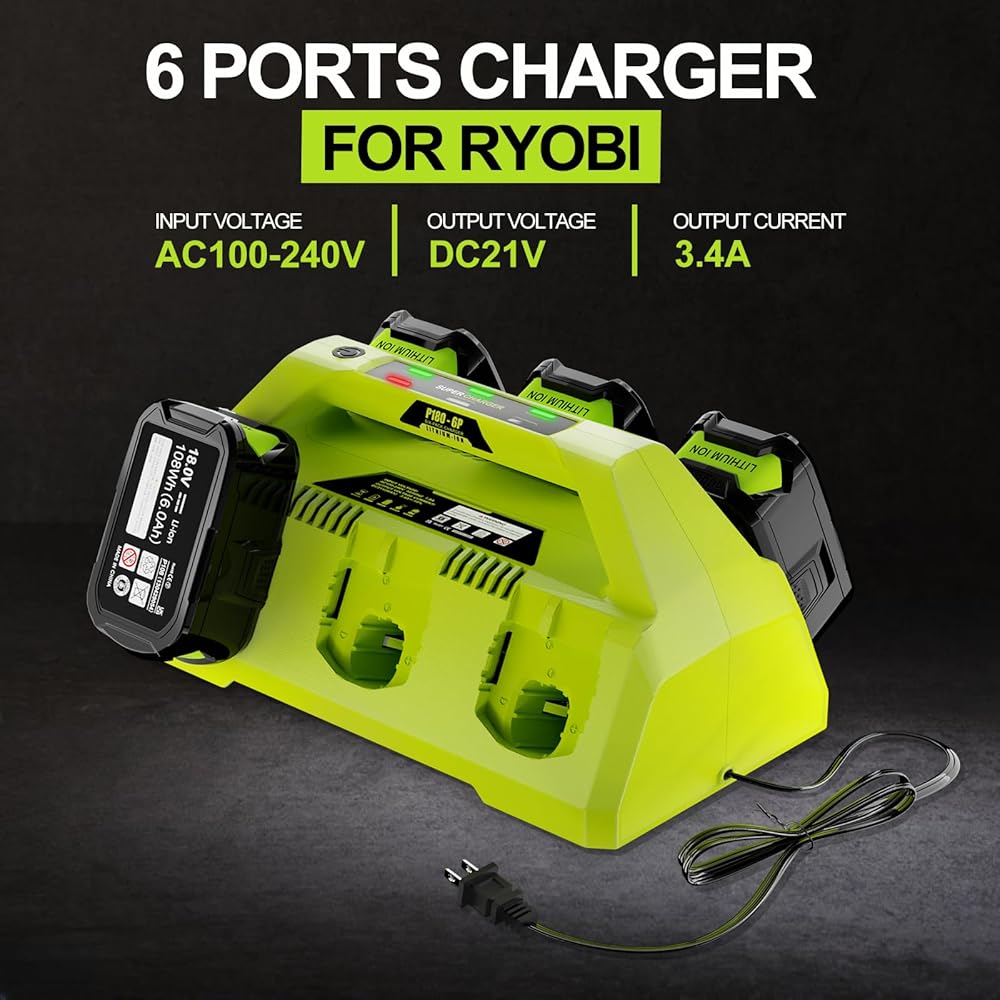 ✔️【شاحن 6 منافذ لبطارية Ryobi 18V】 شاحن 6 منافذ لبطارية RYOBI 18V One+ يمكن أن يحمل ما يصل إلى 6 بطاريات في المرة الواحدة ويسمح لجميع بطارياتي بإعادة الشحن بسرعة وكفاءة.