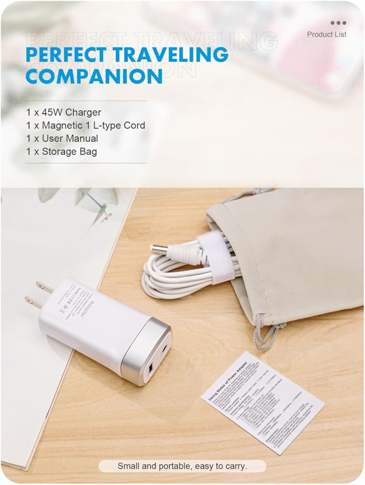 Fast Charging - Highly efficient, reach up to 92% electrical energy conversion rate, quickly charge your macbook. Input: 100-240V, 1.2A; Output: 14.5-14.85V/3.1A Max