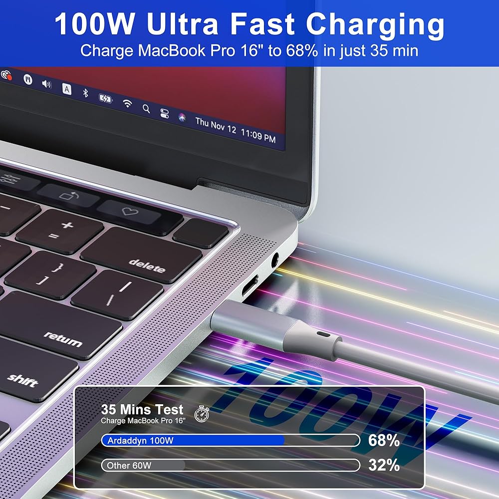 ⚡100 واط PD USB-C شحن سريع: أحدث تقنية 6A 100 واط PD تقدم لك تجربة غير مسبوقة، كابل شحن سريع للغاية من USB C إلى USB C (يصل إلى 100 واط) يمكنه شحن جهاز MacBook Pro الخاص بك بنسبة 100% في 1.9 ساعة، كما يدعم 480 ميجا بايت في الثانية نقل البيانات. عندما تكون في رحلة عمل أو مسافرًا، لا تقلق بشأن انخفاض طاقة البطارية. ملاحظة: تعتمد سرعة الشحن الفعلية على جهازك وشاحن الحائط، كما أن شحن أجهزة متعددة في نفس الوقت سوف يقلل من السرعة. منفذ Lightning/Micro USB يدعم الشحن فقط.