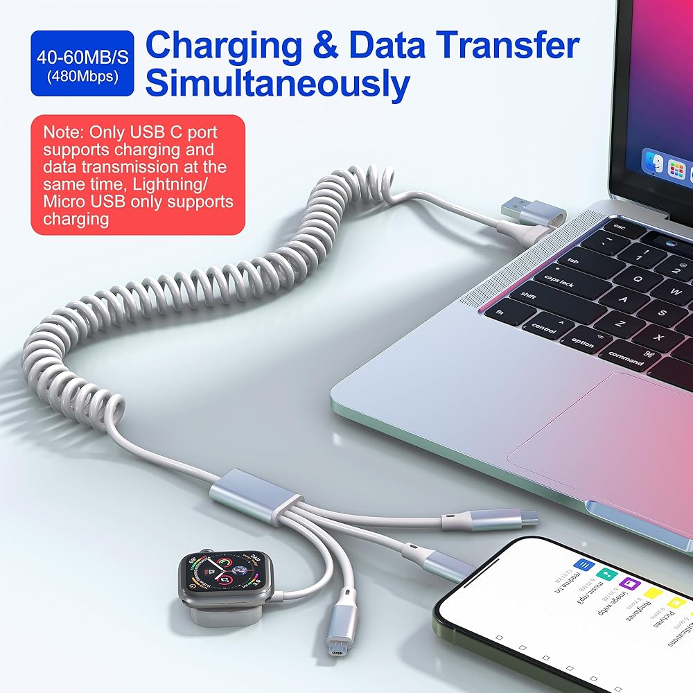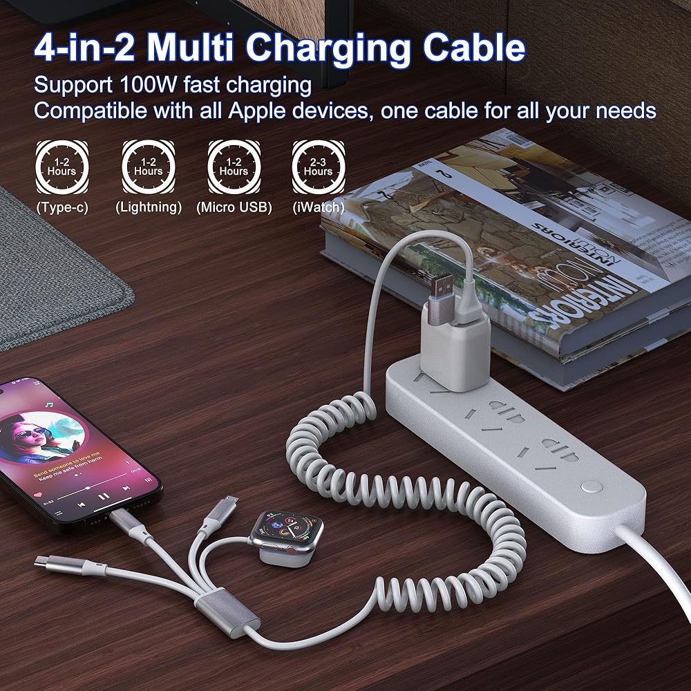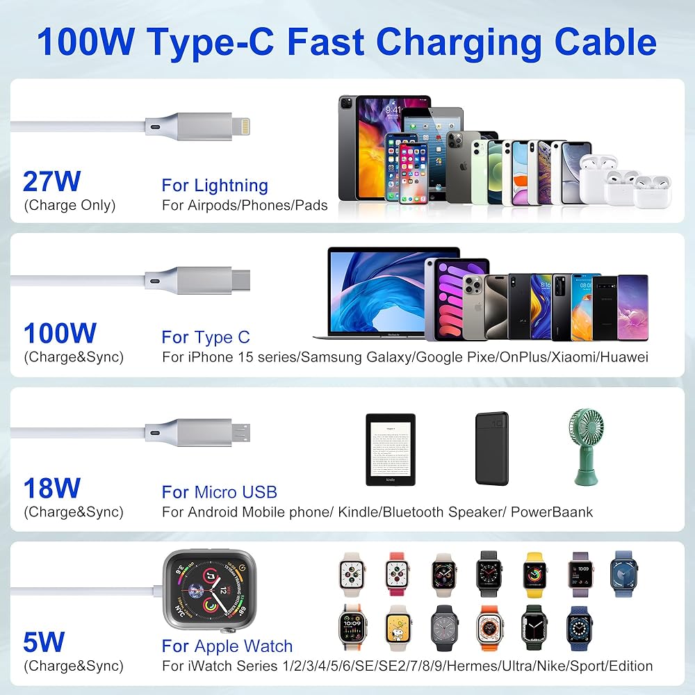 كابل شحن متعدد 100 وات لشاحن ساعة Apple - 4 في 2 كابل شحن محمول لساعة Apple Watch iPhone 15، معتمد من MFi وشاحن سفر قابل للسحب لمزامنة البيانات لجميع iWatch iPhone MacBook Pad Galaxy 4FT