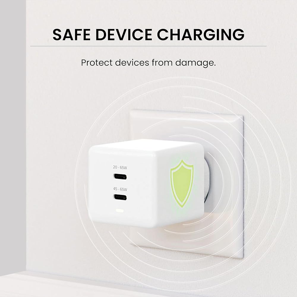 توزيع فعال للطاقة: USB-C GaN-|| يخصص الشاحن بذكاء توصيل طاقة بقدرة 65 واط عندما يكون منفذ واحد نشطًا. عندما يكون كلا منفذي الشحن USB-C قيد الاستخدام في الوقت نفسه، يقوم الشاحن بتقسيم الإخراج، مما يوفر بحد أقصى 45 واط لمنفذ واحد و25 واط للمنفذ الآخر.